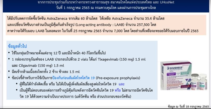 สธ. 18 ก.ค. – อธิบดีกรมควบคุมโรค เผยหารือบ่ายนี้ ถก กทม. รร.แพทย์ เน้นอุดช่องโหว่ ส่งต่อผู้ป่วยใน กทม.ห่วงหลังเปิดทำการปกติ ขอให้เคร่งครัด 2U เนื่องจากหยุดยาว คนเดินทางท่องเที่ยว พร้อมเดินหน้าฉีดภูมิคุ้มกันสำเร็จรูป LAAB ในกลุ่มคนภูมิคุ้มกันต่ำ ไต หรือปลูกถ่ายอวัยวะ หลังพบเป็นกลุ่มเสียชีวิตมากที่สุดในกลุ่มป่วยโรคเรื้อรัง คาดภูมิคุ้มกันสำเร็จมาถึงไทย 25 ก.ค.นี้