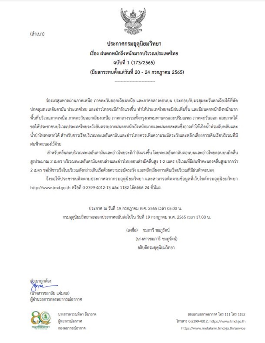 กรมอุตุนิยมวิทยา ออกประกาศ เรื่อง “ฝนตกหนักถึงหนักมากบริเวณประเทศไทย (มีผลกระทบตั้งแต่วันที่ 20-24 กรกฎาคม 2565)” ฉบับที่ 1 ลงวันที่ 19 กรกฎาคม 2565 ระบุว่า ร่องมรสุมพาดผ่านภาคเหนือ ภาคตะวันออกเฉียงเหนือ และภาคกลางตอนบน ประกอบกับมรสุมตะวันตกเฉียงใต้ที่พัดปกคลุมทะเลอันดามัน ประเทศไทย และอ่าวไทย จะมีกำลังแรงขึ้น ทำให้ประเทศไทยจะมีฝนเพิ่มขึ้น และมีฝนตกหนักถึงหนักมาก บริเวณภาคเหนือ ภาคตะวันออกเฉียงเหนือ ภาคกลาง รวมทั้งกรุงเทพมหานครและปริมณฑล ภาคตะวันออก และภาคใต้ ขอให้ประชาชนบริเวณประเทศไทยระวังอันตรายจากฝนตกหนักถึงหนักมากและฝนตกสะสม ซึ่งอาจทำให้เกิดน้ำท่วมฉับพลันและน้ำป่าไหลหลากได้