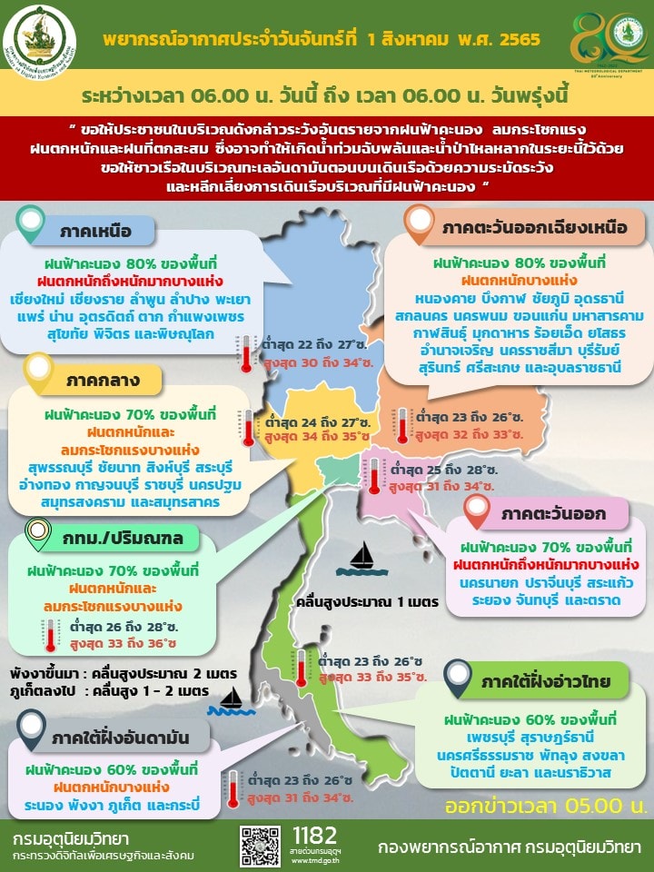 กรมอุตุฯ 1 ส.ค. – กรมอุตุฯ เผยทั่วไทยมีฝนเพิ่มขึ้น โดยมีฝนตกหนักถึงหนักมากบางแห่ง ระวังน้ำท่วมฉับพลันและน้ำป่าไหลหลาก