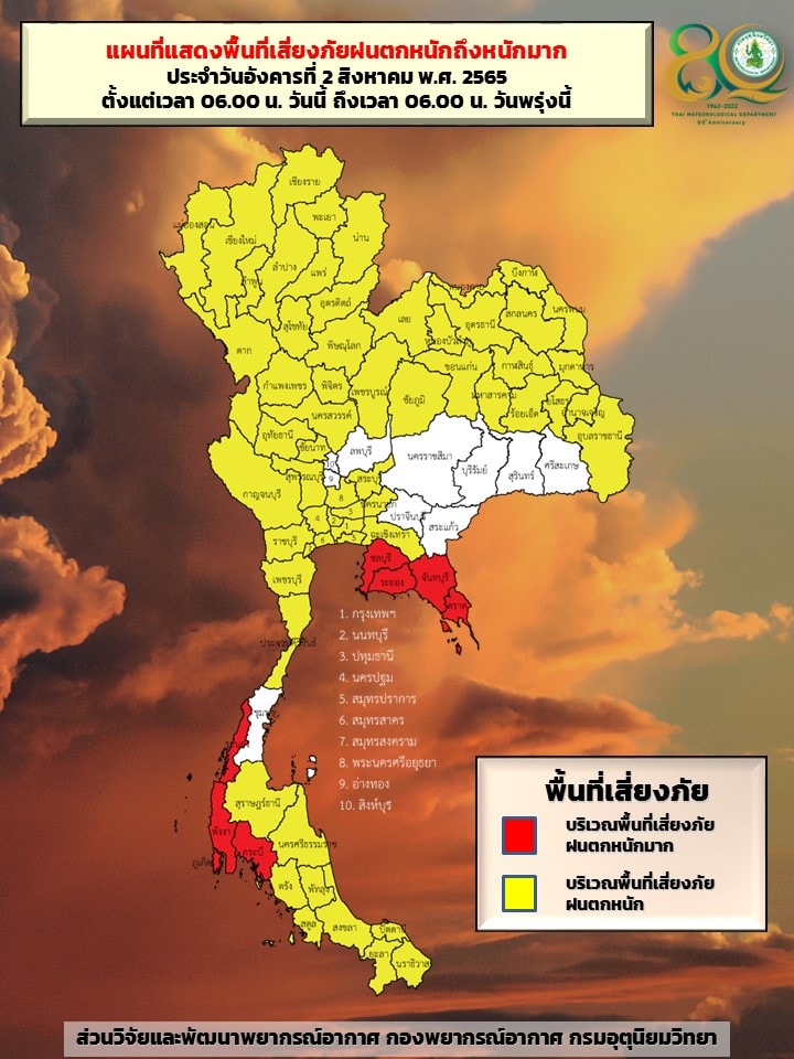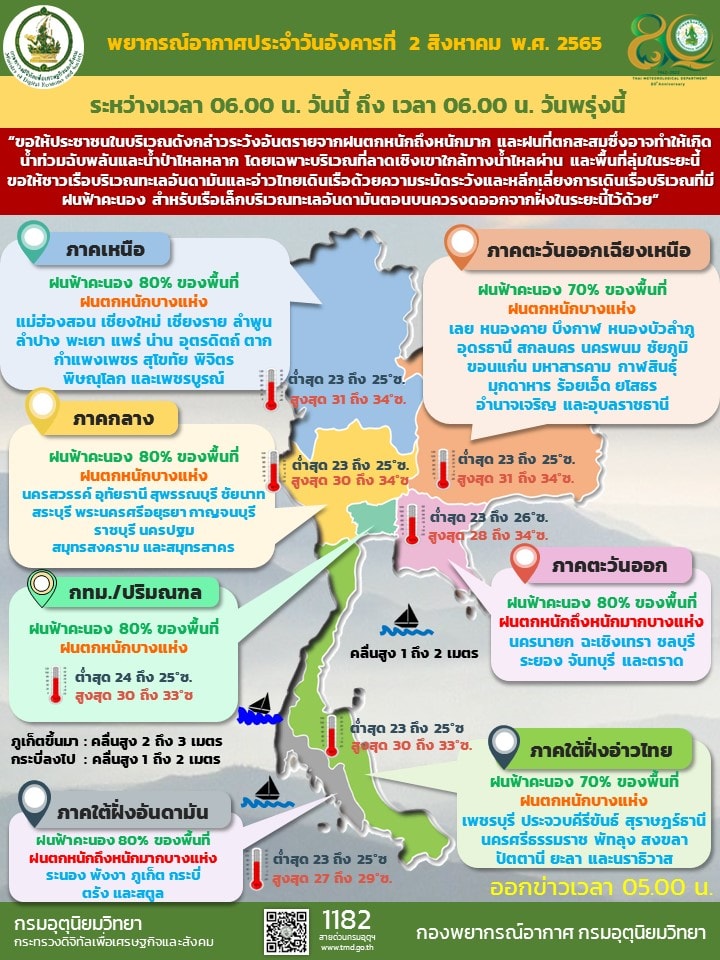 กรมอุตุฯ 2 ส.ค. – กรมอุตุฯ เผยทั่วไทยฝนตกหนักถึงหนักมากบางพื้นที่ ระวังน้ำท่วมฉับพลันและน้ำป่าไหลหลาก สำหรับกรุงเทพฯ และปริมณฑล ฝนฟ้าคะนอง 80% ของพื้นที่ กับมีฝนตกหนักบางแห่ง