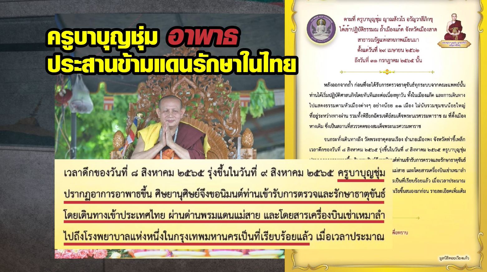 มูลนิธิดอยเวียงแก้ว ออกประกาศว่า ครูบาบุญชุ่ม ญาณสังวโร อรัญวาสีภิกขุ ปรากฏอาการอาพาธ ศิษยานุศิษย์จึงขอนิมนต์ท่านเข้ารับการตรวจและรักษาธาตุขันธ์ โดยเดินทางเข้าประเทศไทยผ่านด่านพรมแดนแม่สาย และโดยสารเครื่องบินเช่าเหมาลำไปถึงโรงพยาบาลแห่งหนึ่งในกรุงเทพมหานครเป็นที่เรียบร้อยแล้ว เมื่อเวลาประมาณเที่ยงคืนที่ผ่านมา โดยในอดีตท่านเคยอาพาธด้วยโรคมาลาเรียขึ้นสมองมาก่อน