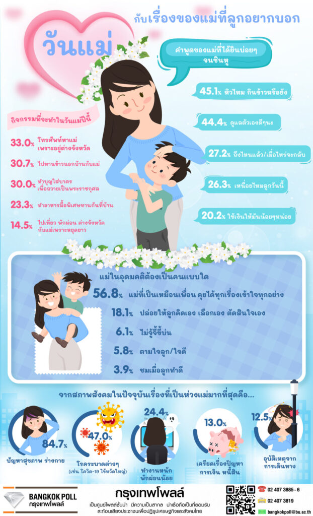กรุงเทพโพลล์ โดยมหาวิทยาลัยกรุงเทพ เผยผลสำรวจความเห็นประชาชนเรื่อง “วันแม่ กับเรื่องของแม่ที่ลูกอยากบอก” พบว่ากิจกรรมที่ลูกๆ จะทำในวันแม่ปีนี้มากที่สุดคือ โทรศัพท์หาแม่ เพราะอยู่ต่างจังหวัด รองลงมา คือไปกินข้าวนอกบ้านกับแม่ และทำบุญใส่บาตร เพื่อถวายเป็นพระราชกุศล
