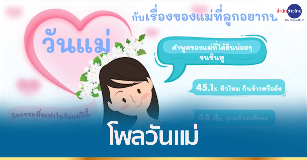 สำหรับแม่ในอุดมคติของลูกๆ ส่วนใหญ่ คือ อยากให้แม่เป็นเหมือนเพื่อนคุยได้ทุกเรื่อง เข้าใจทุกอย่าง รองลงมา คือ ปล่อยให้ลูกคิดเอง เลือกเอง ตัดสินใจเอง และไม่จู้จี้ขี้บ่น ส่วนเรื่องที่เป็นห่วงและวิตกกังวลเกี่ยวกับแม่มากที่สุด จากสภาพสังคมในปัจจุบันนั้น ส่วนใหญ่ระบุว่า เรื่องปัญหาสุขภาพร่างกาย คือ เรื่องโรคระบาดต่างๆ . – สำนักข่าวไทย
