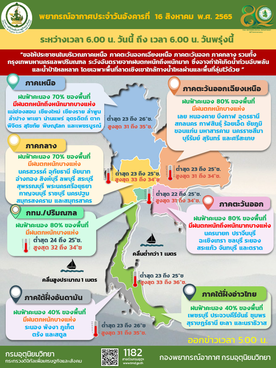 กรมอุตุฯ 16 ส.ค. – กรมอุตุฯ เผยภาคเหนือ ภาคอีสาน ภาคตะวันออก และภาคกลาง มีฝนตกหนักถึงหนักมากบางแห่ง ส่วนกรุงเทพฯ และปริมณฑล ฝนฟ้าคะนอง 80% ของพื้นที่