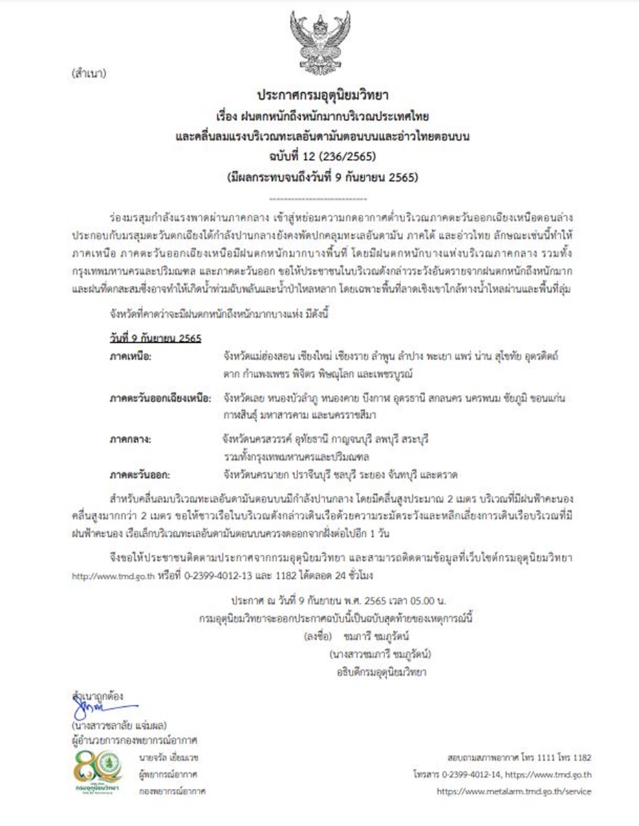 กรมอุตุนิยมวิทยา ออกประกาศ เรื่อง ฝนตกหนักถึงหนักมากบริเวณประเทศไทย และคลื่นลมแรงบริเวณทะเลอันดามันตอนบนและอ่าวไทยตอนบน (มีผลกระทบจนถึงวันที่ 9 กันยายน 2565) ฉบับที่ 12 ลงวันที่ 9 กันยายน 2565 ระบุว่า ร่องมรสุมกำลังแรงพาดผ่านภาคกลาง เข้าสู่หย่อมความกดอากาศต่ำบริเวณภาคตะวันออกเฉียงเหนือตอนล่าง ประกอบกับมรสุมตะวันตกเฉียงใต้กำลังปานกลางยังคงพัดปกคลุมทะเลอันดามัน ภาคใต้ และอ่าวไทย ลักษณะเช่นนี้ทำให้ภาคเหนือ ภาคตะวันออกเฉียงเหนือ มีฝนตกหนักมากบางพื้นที่ โดยมีฝนตกหนักบางแห่งบริเวณภาคกลาง รวมทั้งกรุงเทพมหานครและปริมณฑล และภาคตะวันออก ขอให้ประชาชนในบริเวณดังกล่าวระวังอันตรายจากฝนตกหนักถึงหนักมากและฝนที่ตกสะสม ซึ่งอาจทำให้เกิดน้ำท่วมฉับพลันและน้ำป่าไหลหลาก โดยเฉพาะพื้นที่ลาดเชิงเขาใกล้ทางน้ำไหลผ่านและพื้นที่ลุ่ม