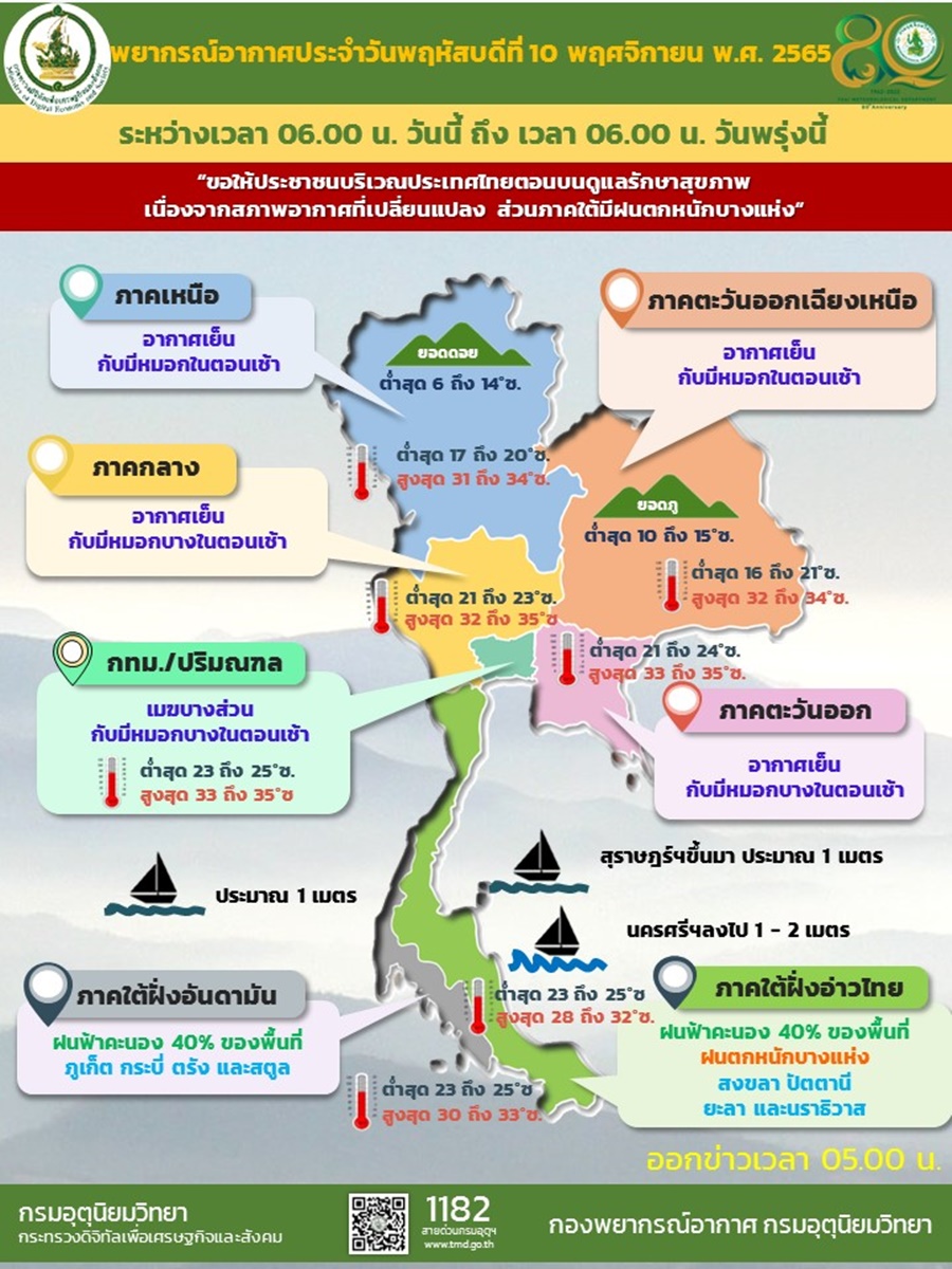 กรมอุตุฯ 10 พ.ย. – กรมอุตุฯ เผยไทยตอนบนอากาศเย็น มีหมอกตอนเช้า ส่วนกรุงเทพฯ และปริมณฑล อุณหภูมิต่ำสุด 23-25 องศาฯ ขณะที่ภาคใต้ตอนล่างมีฝนเพิ่มขึ้นและตกหนักบางแห่ง