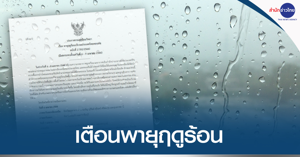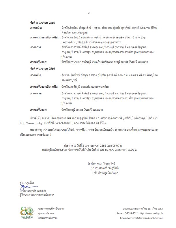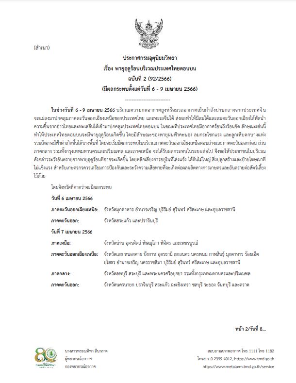 กรมอุตุนิยมวิทยา ออกประกาศ เรื่อง พายุฤดูร้อนบริเวณประเทศไทยตอนบน ฉบับที่ 2 (มีผลกระทบตั้งแต่วันที่ 6-9 เมษายน 2566) ระบุว่า ในช่วงวันที่ 6-9 เมษายน 2566 บริเวณความกดอากาศสูงหรือมวลอากาศเย็นกำลังปานกลางจากประเทศจีนจะแผ่ลงมาปกคลุมภาคตะวันออกเฉียงเหนือของประเทศไทยและทะเลจีนใต้ ส่งผลทำให้มีลมใต้และลมตะวันออกเฉียงใต้พัดนำความชื้นจากอ่าวไทยและทะเลจีนใต้เข้ามาปกคลุมประเทศไทยตอนบน ในขณะที่ประเทศไทยมีอากาศร้อนถึงร้อนจัด ลักษณะเช่นนี้ทำให้ประเทศไทยตอนบนจะมีพายุฤดูร้อนเกิดขึ้น โดยมีลักษณะของพายุฝนฟ้าคะนอง ลมกระโชกแรง และลูกเห็บตกบางแห่ง รวมถึงอาจมีฟ้าผ่าเกิดขึ้นได้บางพื้นที่ โดยจะเริ่มมีผลกระทบในบริเวณภาคตะวันออกเฉียงเหนือตอนล่างและภาคตะวันออกก่อน ส่วนภาคกลาง รวมทั้งกรุงเทพมหานครและปริมณฑล และภาคเหนือ จะได้รับผลกระทบในระยะต่อไป จึงขอให้ประชาชนในบริเวณดังกล่าวระวังอันตรายจากพายุฤดูร้อนที่อาจจะเกิดขึ้น โดยหลีกเลี่ยงการอยู่ในที่โล่งแจ้ง ใต้ต้นไม้ใหญ่ สิ่งปลูกสร้างและป้ายโฆษณาที่ไม่แข็งแรง สำหรับเกษตรกรควรเตรียมการป้องกันและระวังความเสียหายที่จะเกิดต่อผลผลิตทางการเกษตรและอันตรายต่อสัตว์เลี้ยงไว้ด้วย