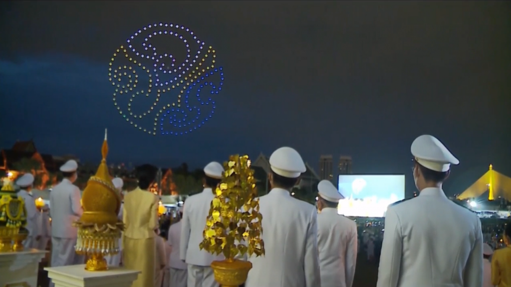 ขณะที่สมาคมกีฬาเครื่องบินจำลองและวิทยุบังคับ กับบริษัท เอไอ แอนด์ โรโบติกส์ เวนเจอร์ส จัดบินโดรนเฉลิมพระเกียรติพระบาทสมเด็จพระเจ้าอยู่หัว ที่สนามฟุตบอลของมหาวิทยาลัยธรรมศาสตร์ ท่าพระจันทร์ ซึ่งครั้งนี้ทางทีมงานได้พัฒนาโดรนแปรอักษรขึ้นมาใหม่ จำนวน 500 ลำ จัดแสดงการบิน 2 ชุด รวม 11 รูปภาพ โดยชุดแรก 6 รูปภาพ ใช้ชื่อชุดว่า “เฉลิมพระเกียรติเนื่องในโอกาสวันเฉลิมพระชนมพรรษา พระบาทสมเด็จพระเจ้าอยู่หัว” เริ่มจากการบิน รูปธงชาติไทยที่ปลิวสะบัดบนท้องฟ้า ต่อด้วย พระปรมาภิไธยย่อ วปร., พระบรมสาทิสลักษณ์พระบาทสมเด็จพระเจ้าอยู่หัว, พระบรมสาทิสลักษณ์พระบาทสมเด็จพระเจ้าอยู่หัวทรงจักรยาน พร้อมโบกพระหัตถ์, อักษรคำว่า LONG LIVE THE KING Rama X (เลข 10 โรมัน), อักษรคำว่า ทรงพระเจริญ