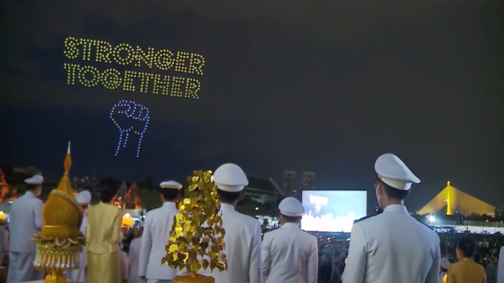 ส่วนการแสดงชุดที่ 2 อีก 5 รูปภาพ ชื่อชุดว่า “ในหลวงทรงห่วงใย” เริ่มจากอักษรคำว่า ในหลวงทรงห่วงใย, แพทย์ พยาบาล และอักษรคำว่า Take care, อักษรคำว่า THANK YOU HEROS, อักษรคำว่า STRONGER TOGETHER และอักษรคำว่า เราจะผ่านไปด้วยกัน. – สำนักข่าวไทย