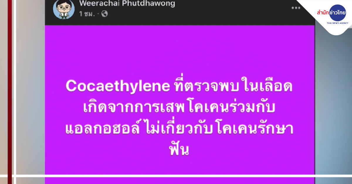 ล่าสุด รศ.ดร.วีรชัย พุทธวงศ์ หรือ อาจารย์อ๊อด อาจารย์ประจำภาควิชาเคมี คณะศิลปศาสตร์และวิทยาศาสตร์ มหาวิทยาลัยเกษตรศาสตร์ โพสต์ข้อความผ่านทางเฟซบุ๊กส่วนตัว ระบุว่า “Cocaethylene ที่ตรวจพบในเลือดเกิดจากการเสพโคเคนร่วมกับแอลกอฮอล์ ไม่เกี่ยวกับโคเคนรักษาฟัน” และชี้ว่า “โคเคนที่ใช้เป็นยาชาเฉพาะที่ใช้ในงานทันตกรรม คือ คือ Lidocaine หมอใช้ปริมาณน้อย ต่างจากตัวที่ตรวจพบในเลือด”.-สำนักข่าวไทย