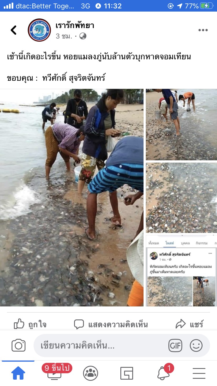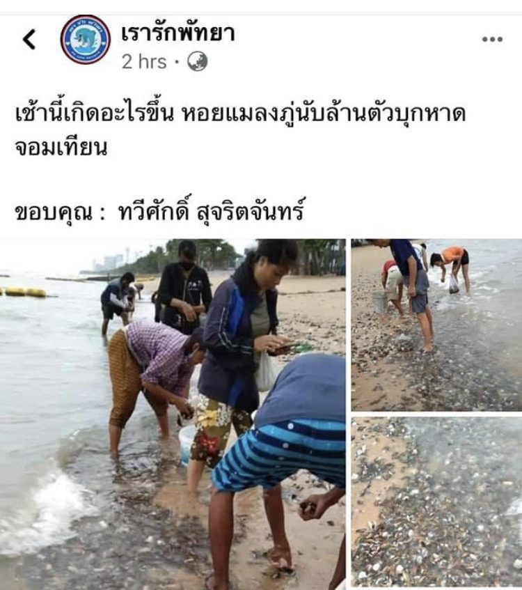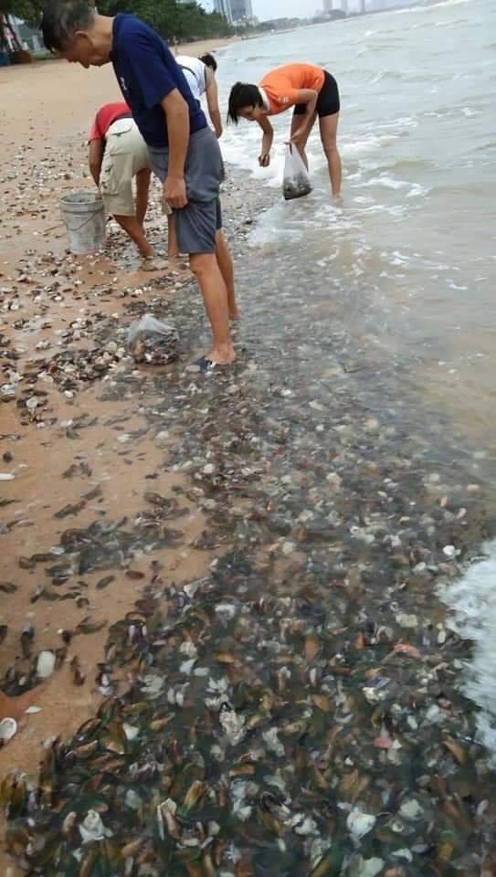 เพจเฟซบุ๊ก เรารักพัทยา ได้แชร์ภาพจากเฟซบุ๊กส่วนตัวของคุณทวีศักดิ์ สุจริตจันทร์ โพสข้อมูลบนเฟซบุ๊กว่า พิกัดจอมเทียนครับ เกิดอะไรขึ้นหอยแมลงภู่ขึ้นมาเต็มหาดเลยครับ พร้อมลงภาพบริเวณหาดจอมเทียนมีหอยแมลงภู่บนหาดทรายจำนวนมาก โดยมีประชาชนต่างสงสัยและเก็บหอยไปด้วยเช่นกัน