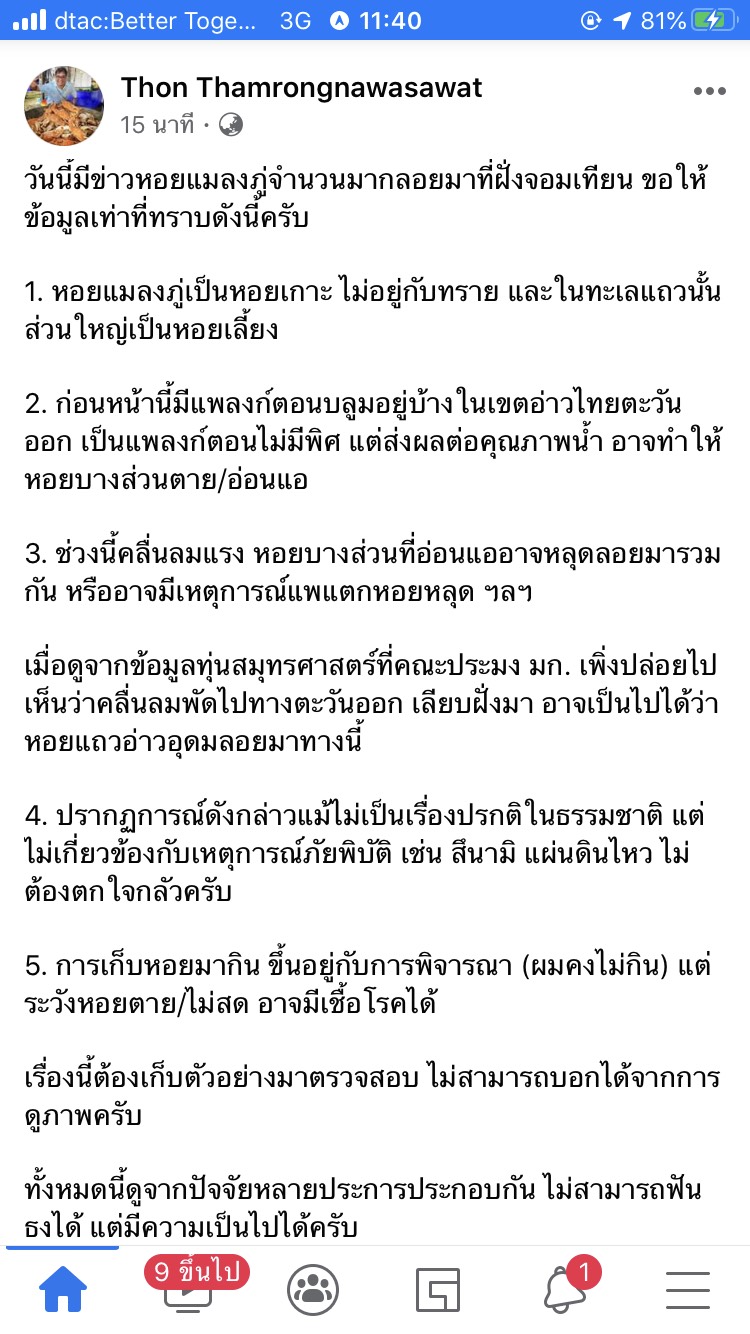 ด้าน ผศ.ดร.ธรณ์ ธำรงนาวาสวัสดิ์ รองคณบดีฝ่ายกิจการพิเศษและประชาสัมพันธ์ คณะประมง มหาวิทยาลัยเกษตรศาสตร์ ได้แสดงความเห็นบนเฟซบุ๊กส่วนตัวไว้ด้วยเช่นกันว่า วันนี้มีข่าวหอยแมลงภู่จำนวนมากลอยมาที่ฝั่งจอมเทียน ขอให้ข้อมูลเท่าที่ทราบดังนี้ครับ