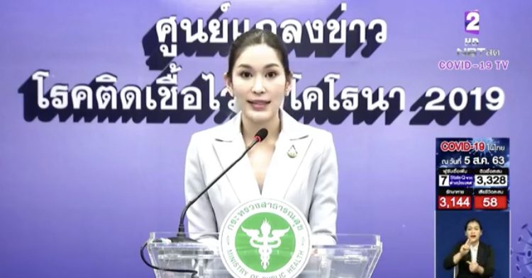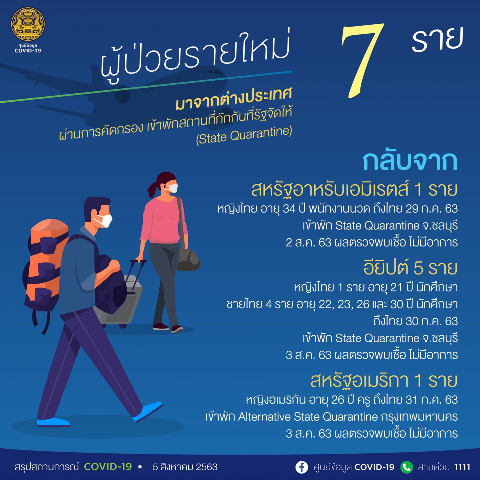 พญ.พรรณประภา ยงค์ตระกูล ผู้ช่วยโฆษก ศบค.กล่าวในการแถลงข่าวสถานการณ์โควิด -19 ประจำวันที่ 5ส.ค.63 ว่า พบผู้ป่วยรายใหม่ เพิ่ม 7 คน ทำให้มีผู้ป่วยสะสม 3,328 คน เป็นติดเชื้อในประเทศ 2,444 คน ติดเชื้อต่างประเทศ 391 คน รักษาหายแล้ว 3,144 คน และ เสียชีวิต 58 คน