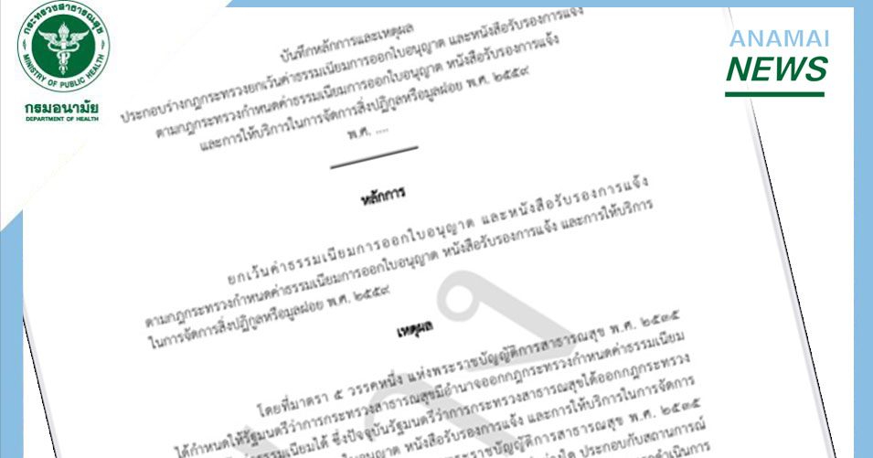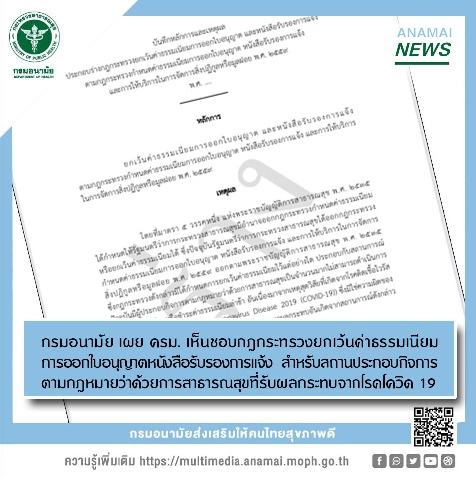 กรมอนามัย 7 ส.ค.-อธิบดีกรมอนามัย เผยครม.มีมติเห็นชอบกฎกระทรวงยกเว้นค่าธรรมเนียมการออกใบอนุญาตฯ สถานประกอบกิจการตามกฎหมายว่าด้วยการสาธารณสุขที่ได้รับผลกระทบจากมาตรการสั่งปิดสถานที่เป็นการชั่วคราว เพื่อป้องกันการแพร่ระบาดของโรคโควิด- 19