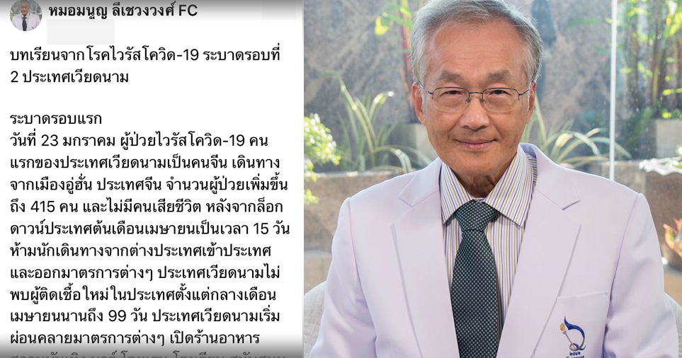 นพ.มนูญ ลีเชวงวงศ์ แพทย์เฉพาะทางด้านโรคระบบการหายใจ รพ.วิชัยยุทธ โพสต์ข้อความผ่านเฟซบุ๊ก “หมอมนูญ ลีเชวงวงศ์ FC” ว่า บทเรียนจากโรคไวรัสโควิด-19 ระบาดรอบที่ 2 ประเทศเวียดนาม