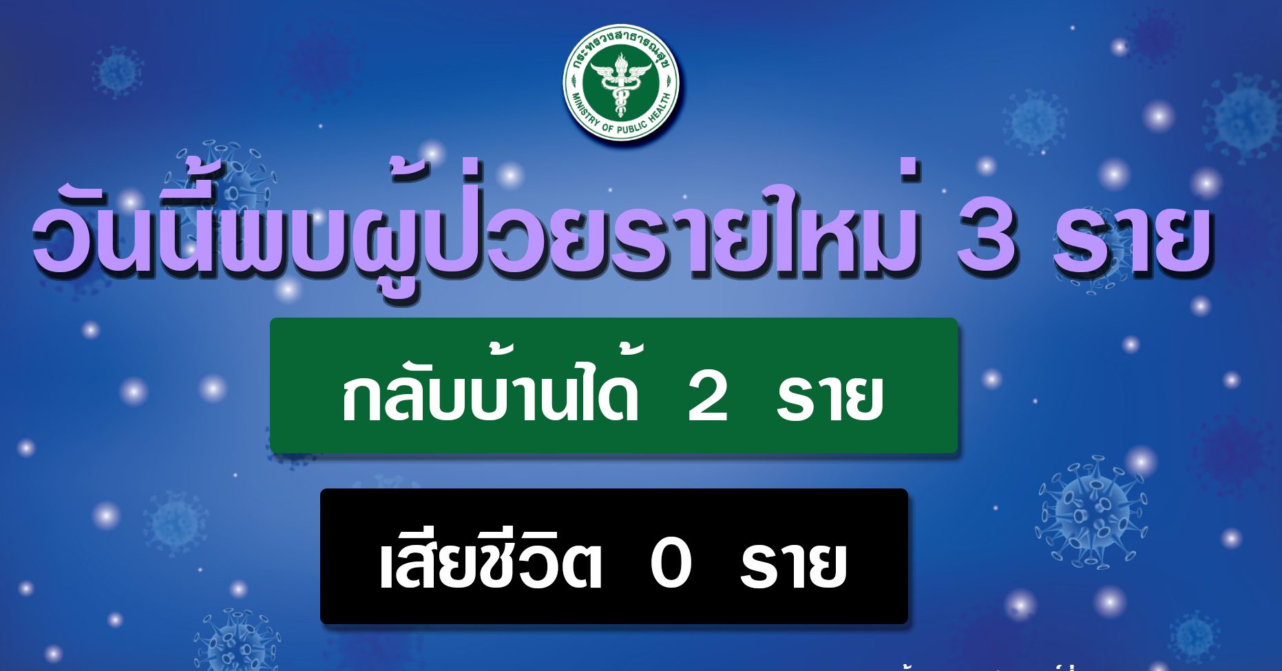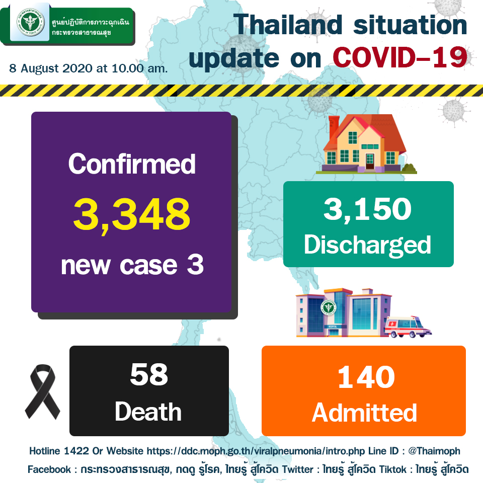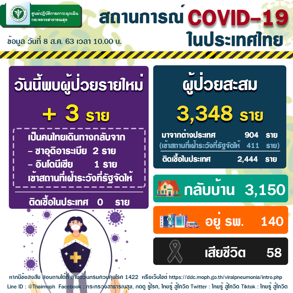 ศูนย์บริหารสถานการณ์โควิด-19 (ศบค.) เปิดเผยสถานการณ์โรคโควิด-19 ประจำวันผ่านเฟซบุ๊กศูนย์ข้อมูล COVID-19 ว่า มีผู้ป่วยรายใหม่ 3 คน จากสถานเฝ้าระวังที่รัฐจัดให้ หรือสเตทควอรันทีน รักษาหายเพิ่ม 2 คน ไม่มีเสียชีวิตเพิ่มเติม ผู้ป่วยสะสมรวม 3,348 คน แบ่งเป็นผู้ที่เดินทางมาจากต่างประเทศ และอยู่ใน สเตทควอรันทีน 411 คน หายกลับบ้านรวม 3,150 คน ยังรักษาใน รพ. 140 คน เสียชีวิตรวม 58 คน