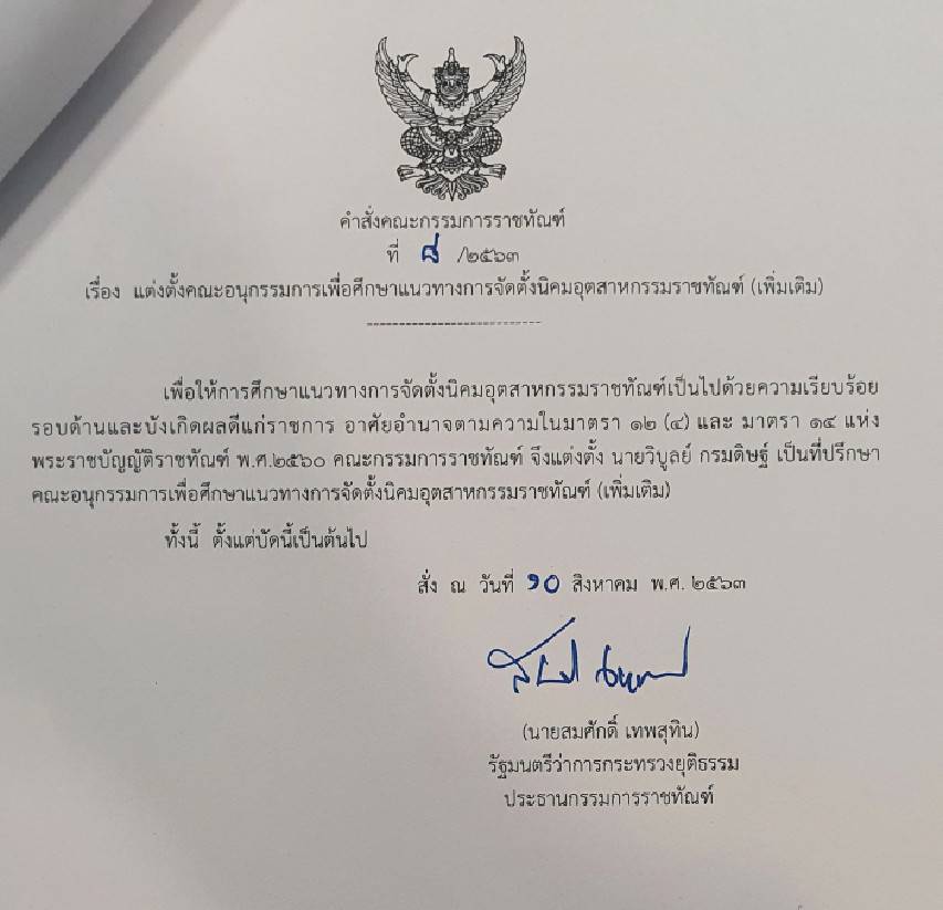 นายสมศักดิ์ เทพสุทิน รัฐมนตรีว่าการกระทรวงยุติธรรม ลงนามในหนังสือคำสั่งแต่งตั้งเพิ่มเติมนายวิบูลย์ กรมดิษฐ์ กรรมการบริหารและประธานเจ้าหน้าที่การตลาด บริษัท อมตะ คอร์ปอเรชัน จำกัด (มหาชน) เป็นที่ปรึกษาอนุกรรมการเพื่อศึกษาแนวทางการจัดตั้งนิคมอุตสาหกรรมราชทัณฑ์