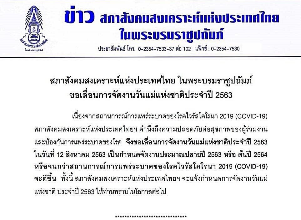 ทั้งนี้ สำหรับการจัดงานวันแม่แห่งชาติ ประจำปี 2563 ซึ่งจะมีการคัดเลือกและประกาศรายชื่อแม่ดีเด่นและลูกกตัญญู เพื่อรับโล่เกียรติคุณนั้น สภาสังคมสงเคราะห์ฯ แจ้งขอเลื่อนการจัด เนื่องจากสถานการณ์การแพร่ระบาดของโรคโควิด-19 คำนึงถึงความปลอดภัยต่อสุขภาพของผู้ร่วมงานและป้องกันการแพร่ระบาดของโรค จึงขอเลื่อนการจัดงานวันแม่แห่งชาติประจำปี 2563 ในวันที่ 12 สิงหาคม 2563 เป็นกำหนดจัดงานประมาณปลายปี 2563 หรือต้นปี 2564 หรือจนกว่าสถานการณ์การแพร่ระบาดของโรคจะดีขึ้น ทั้งนี้ สภาสังคมสงเคราะห์ฯ จะแจ้งกำหนดการจัดงานวันแม่แห่งชาติ ประจำปี 2563 ให้ทราบในโอกาสต่อไป