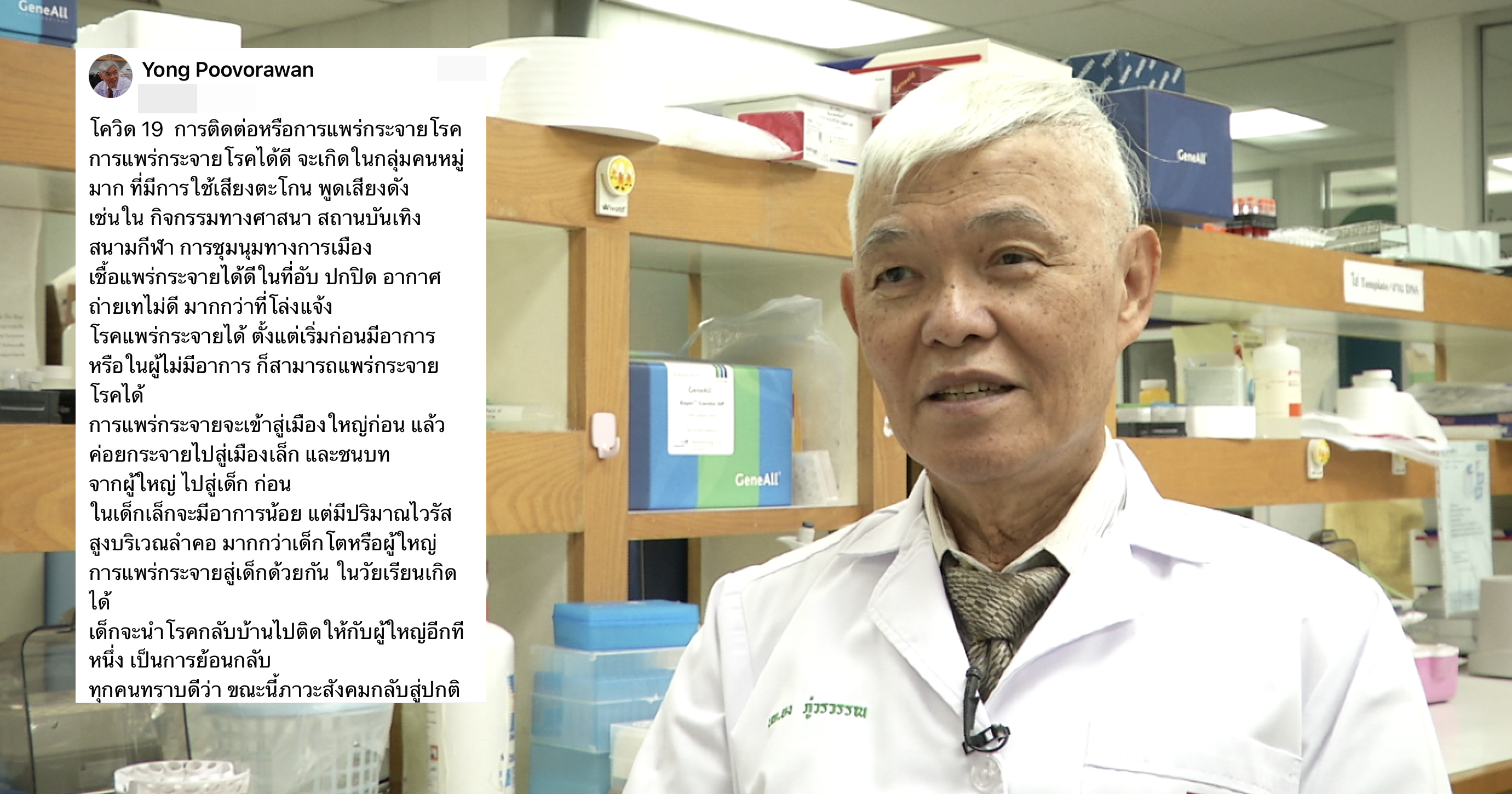 ศ.นพ.ยง ภู่วรวรรณ หัวหน้าศูนย์เชี่ยวชาญเฉพาะทางด้านไวรัสวิทยาคลินิก ภาควิชากุมารเวชศาสตร์ คณะแพทยศาสตร์ จุฬาลงกรณ์มหาวิทยาลัย โพสต์เฟซบุ๊กวันนี้ (18ส.ค.) เรื่อง โควิด-19 การติดต่อหรือการแพร่กระจายโรค โดยระบุว่า การแพร่กระจายโรคได้ดี จะเกิดในกลุ่มคนหมู่มาก ที่มีการใช้เสียงตะโกน พูดเสียงดัง เช่นใน กิจกรรมทางศาสนา สถานบันเทิง สนามกีฬา การชุมนุมทางการเมือง เชื้อแพร่กระจายได้ดีในที่อับ ปกปิด อากาศถ่ายเทไม่ดี มากกว่าที่โล่งแจ้ง