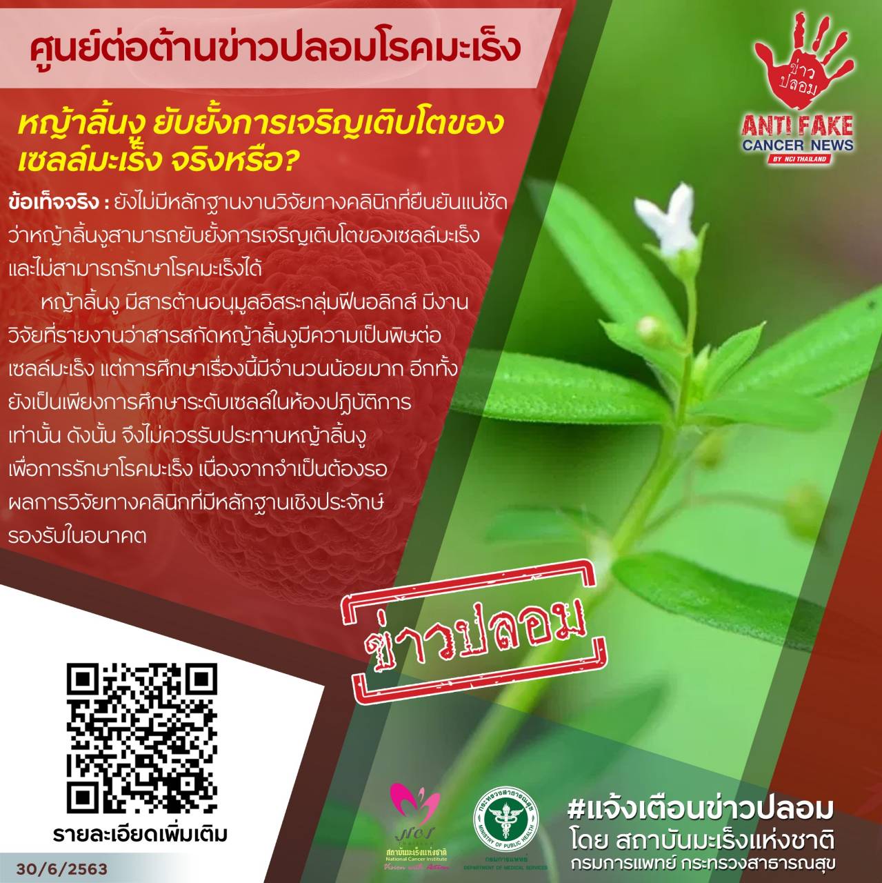 กรุงเทพฯ 18 ส.ค.- สถาบันมะเร็งฯ แจง “หญ้าลิ้นงูยับยั้งการเจริญเติบโตของเซลล์มะเร็ง” ตรวบสอบแล้ว ยังไม่มีหลักฐานงานวิจัยทางคลินิกยืนยันแน่ชัดว่าสามารถยับยั้งได้ รวมทั้งไม่สามารถรักษาโรคมะเร็งได้