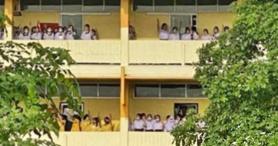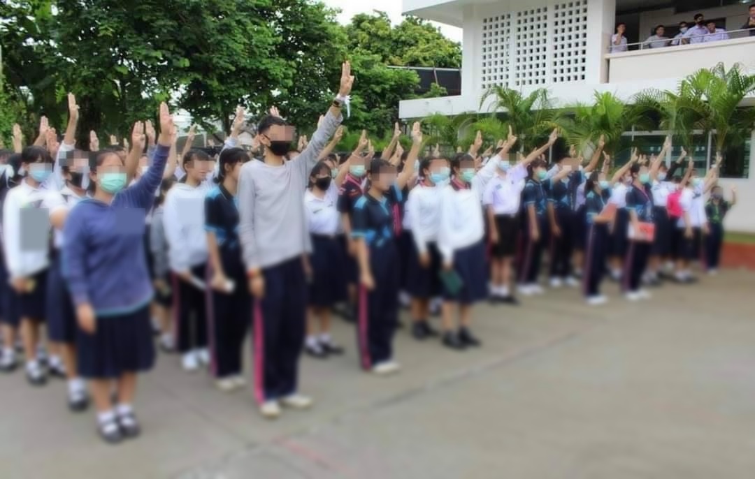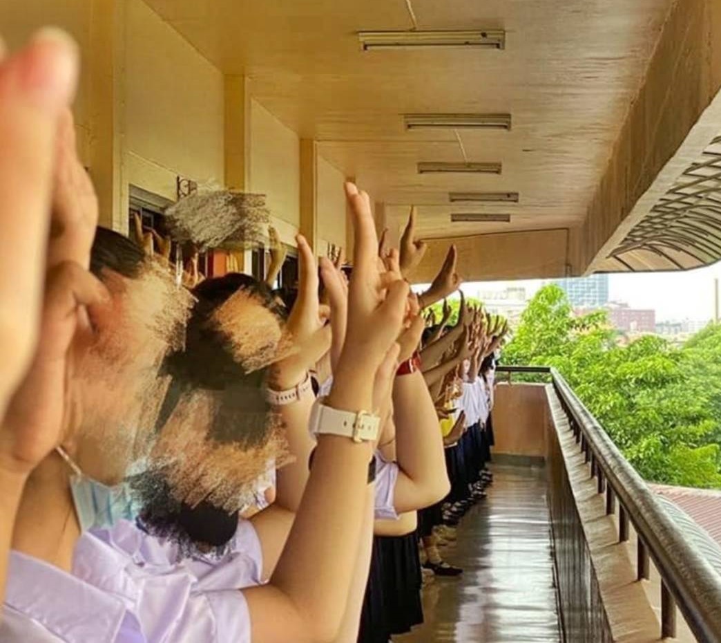 กรุงเทพฯ 19 ส.ค.-โซเชียลแชร์ภาพนักเรียนโรงเรียนมัธยมดัง ร่วมชู 3 นิ้ว เช่นเดียวกับอีกหลายโรงเรียน จัดกิจกรรมเคลื่อนไหว ชู 3 นิ้วและการติดโบว์สีขาว