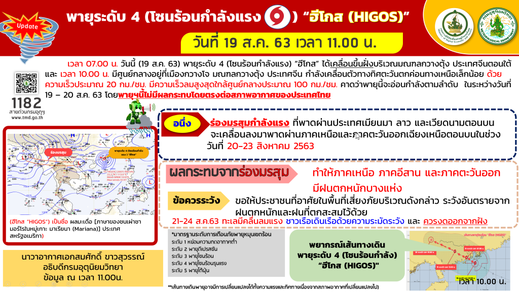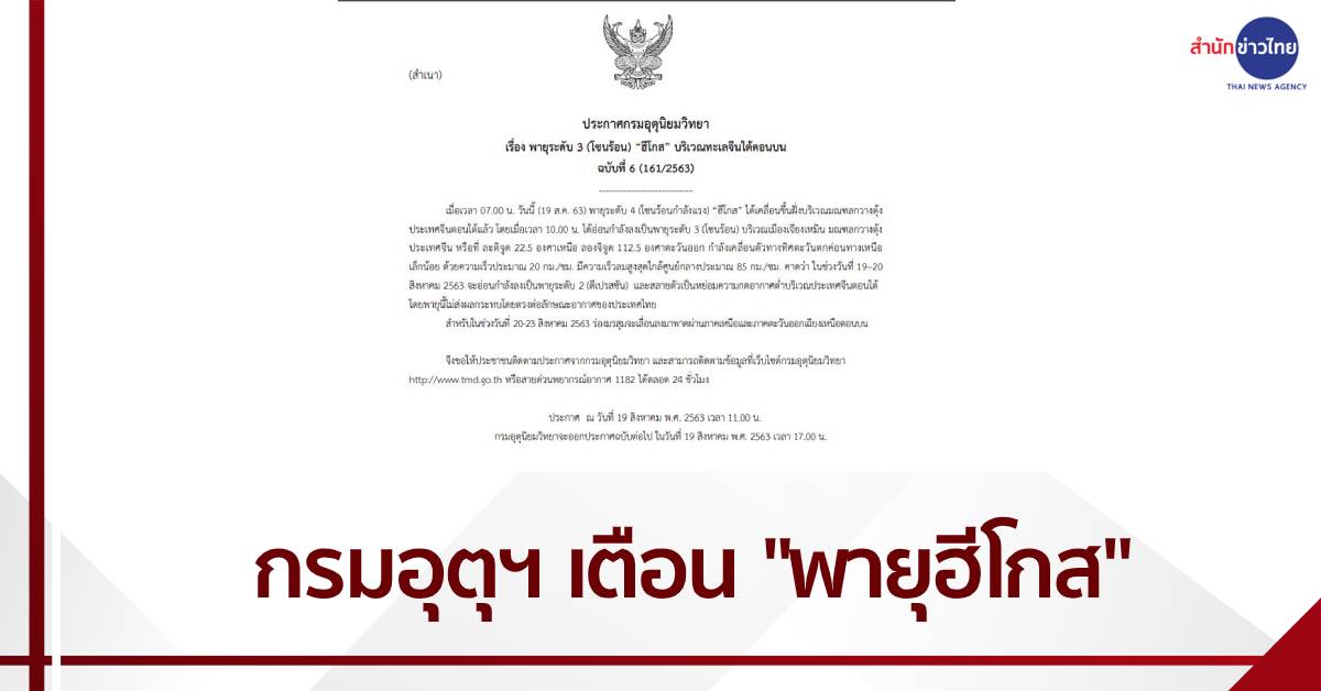 กรมอุตุนิยมวิทยา ออกประกาศฉบับที่ 6 วันที่ 19 สิงหาคม 2563 เตือนรับมือพายุฮีโกส ซึ่งล่าสุดได้อ่อนกำลังลงจากพายุระดับ 4 (โซนร้อนกำลังแรง) เป็นพายุระดับ 3 (โซนร้อน) บริเวณเมืองเจียงเหมิน มณฑลกวางตุ้ง ประเทศจีน ซึ่งกำลังเคลื่อนตัวทางทิศตะวันตก ด้วยความเร็วประมาณ 20 กม./ชม. มีความเร็วลมสูงสุดใกล้ศูนย์กลางประมาณ 85 กม./ชม. คาดว่าในช่วงวันที่ 19–20 สิงหาคม 2563 จะอ่อนกำลังลงเป็นพายุระดับ 2 (ดีเปรสชัน) และสลายตัวเป็นหย่อมความกดอากาศต่ำบริเวณประเทศจีนตอนใต้ โดยจะส่งผลบางส่วนให้หลายจังหวัดของไทยบริเวณภาคเหนือ ภาคตะวันออกเฉียงเหนือ และภาคตะวันออก โดยเฉพาะ จ. เชียงราย พะเยา น่าน แม่ฮ่องสอน เชียงใหม่ ตาก หนองคาย และบึงกาฬ