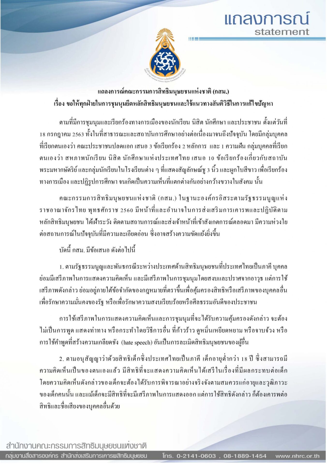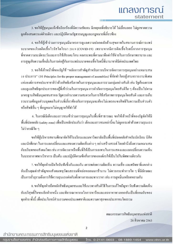 20 ส.ค. – แถลงการณ์คณะกรรมการสิทธิมนุษยชนแห่งชาติ (กสม.) เรื่อง ขอให้ทุกฝ่ายในการชุมนุมยึดหลักสิทธิมนุษยชนและใช้แนวทางสันติวิธีในการแก้ไขปัญหา