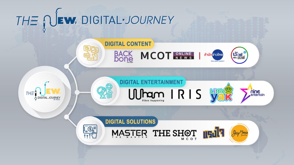 ทศวรรษใหม่ของ อสมท หลังจากที่ทีมงานดิจิทัลมีความพร้อมมากขึ้น อสมท ได้ขับเคลื่อนธุรกิจเทคโนโลยี ภายใต้แนวคิด “The New Digital Journey” โดยขยายการเดินทางสู่ 3 เส้นทางใหม่ ประกอบด้วย Digital Content, Digital Entertainment, และ Digital Solutions เพิ่มการผลิต Contents ให้มีความหลากหลายมากขึ้น ขยายช่องทาง Entertainment ไปอยู่บนแพลตฟอร์มพันธมิตรดิจิทัลใหม่ๆ ที่ทันสมัย รวมถึงการเปิดตัว Digital Solutions ใหม่ๆ ผ่านแพลตฟอร์มที่ตอบสนองความต้องการ และไลฟ์สไตล์ของผู้บริโภคในยุค New Normal