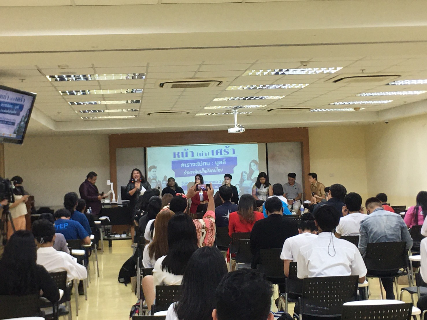 นักวิชาการ นักเคลื่อนไหวด้านสิทธิมนุษยชน กลุ่มคนข้ามเพศ มูลนิธิเพื่อนกะเทยเพื่อสิทธิมนุษยชน เครือข่ายผู้ปกครองที่มีบุตรหลานหลากหลายเพศ นางแบบและนักกิจกรรมต้านบูลลี่ รวมถึงอินฟลูเอนเซอร์ชื่นดัง ร่วมเสวนา ในหัวข้อ “เราจะไม่ทน :บูลลี่ :อำนาจนิยมในสังคมไทย “ โดยได้ร่วมแลกเปลี่ยนประสบการณ์ถูกเลือกปฏิบัติ ถูกกลั่นแกล้ง หรือ”บูลลี่ “ และสะท้อนปัญหาการกลั่นแกล้งในสังคมไทย
