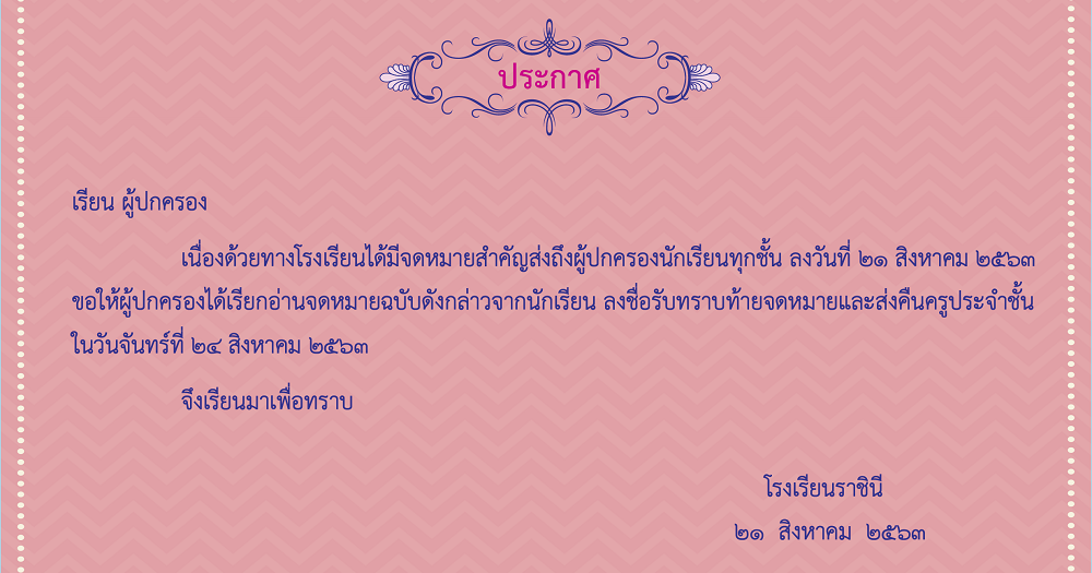 จึงเรียนมาเพื่อทราบ ขอให้ผู้ปกครองดูแลนักเรียนอย่างใกล้ชิด และโรงเรียนพร้อมจะให้ความร่วมมือกับผู้ปกครองในการดูแลอบรมนักเรียนดังที่เคยปฏิบัติเสมอมา หากผู้ปกครองคนใดไม่พอใจเรื่องที่โรงเรียนแจ้งนี้ โรงเรียนยอมรับ “สิทธิ์ของผู้ปกครอง” ที่จะนำนักเรียนลาออกไปเรียนที่โรงเรียนอื่น