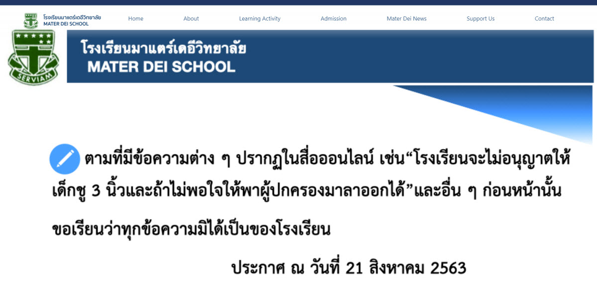 ขณะเดียวกัน เวบไซต์ของโรงเรียนมาแตร์เดอีวิทยาลัย Mater Dei School โพสต์ประกาศอย่างเป็นทางการจากโรงเรียนมาแตร์เดอีวิทยาลัย ระบุว่าตามที่มีข้อความต่างๆ ปรากฎในสื่อออนไลน์เช่น “โรงเรียนจะไม่อนุญาตให้เด็กชู 3 นิ้ว และถ้าไม่พอใจ ให้พาผู้ปกครองมาลาออกได้” และอื่นๆ ก่อนหน้านั้น ขอเรียนว่า ทุกข้อความมิได้เป็นของโรงเรียน ประกาศ ณ วันที่ 21 สิงหาคม 2563 .-สำนักข่าวไทย