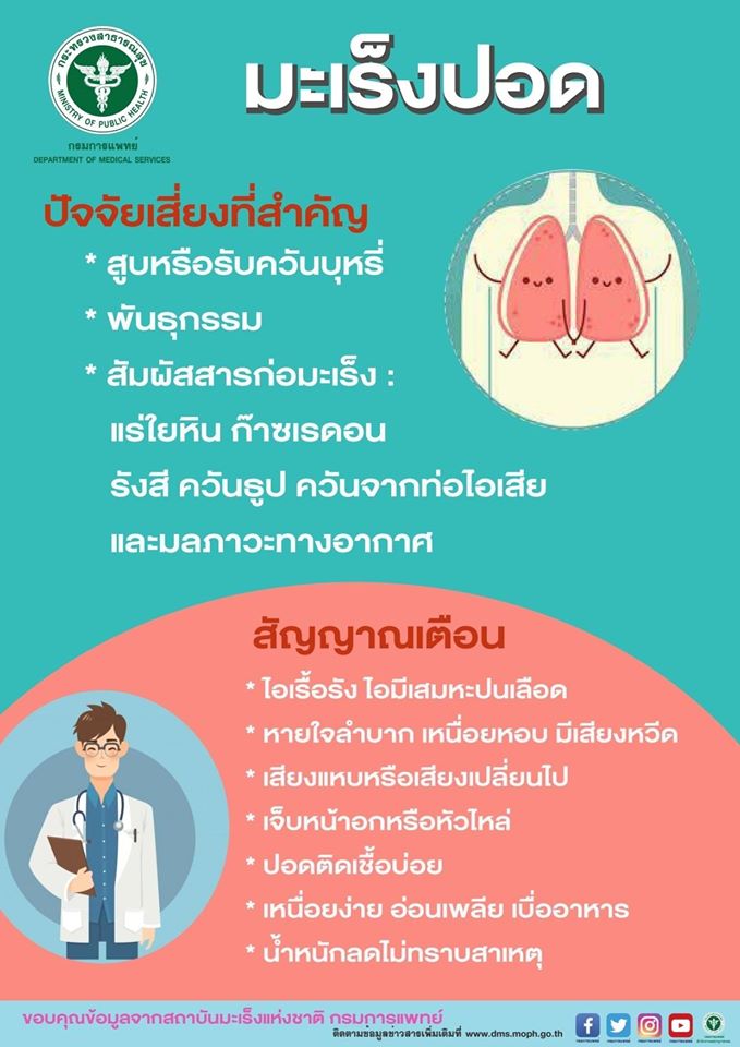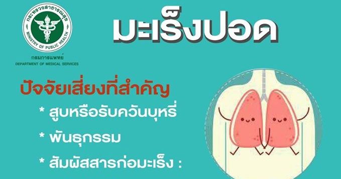 กรมการแพทย์ 22 ส.ค.-สถาบันมะเร็งฯ เผยคนไทยป่วยมะเร็งปอดเพิ่มขึ้นวันละ 42คน แนะผู้มีปัจจัยเสี่ยง “สูบหรือรับควันบุหรี่-พันธุกรรม-สัมผัสสารก่อมะเร็ง” เข้ารับตรวจคัดกรอง พบระยะเริ่มต้น เข้ารับการรักษาตั้งแต่แรกๆ ช่วยลดความเสี่ยง-ลดการเสียชีวิตลงได้