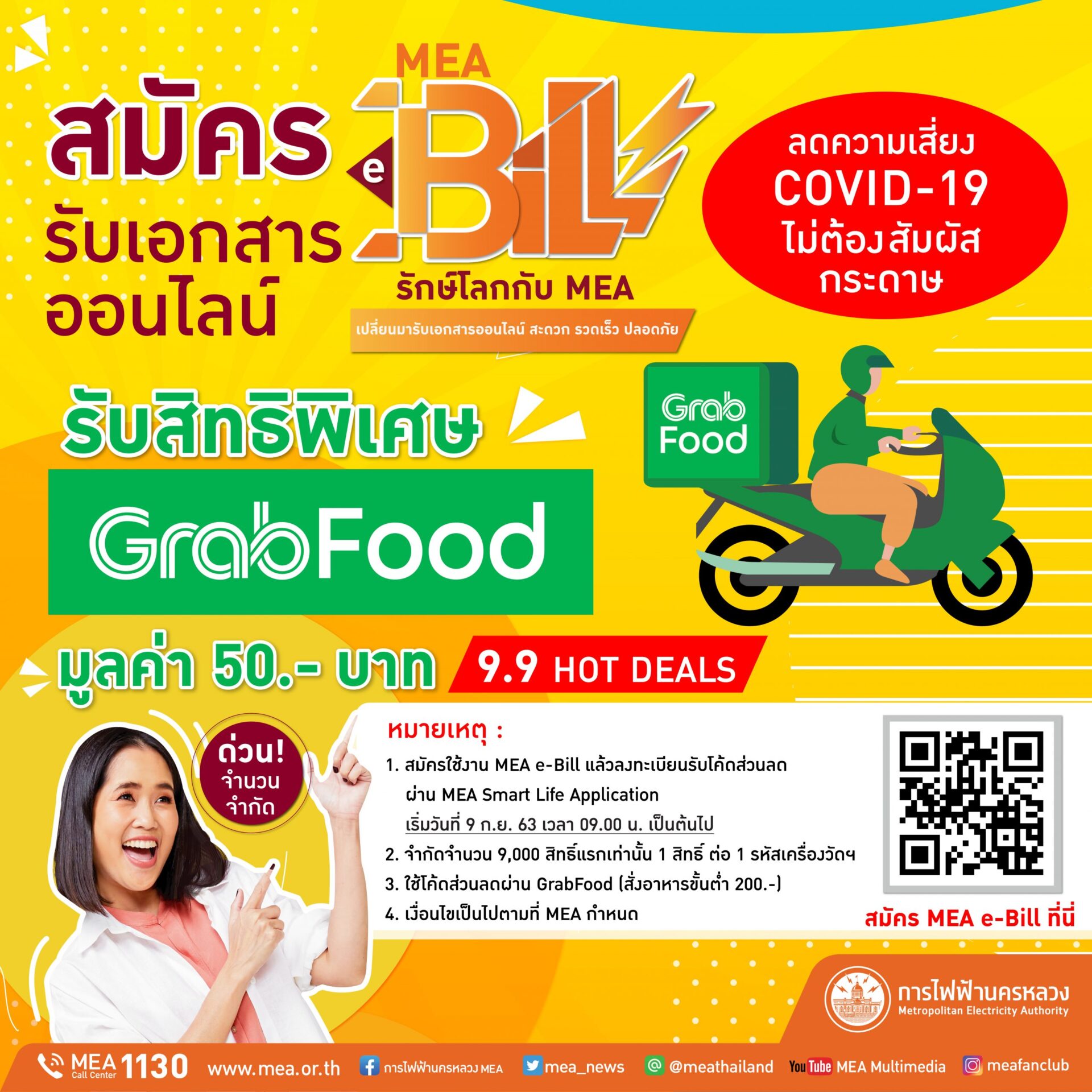 🤗รักษ์โลกกับ MEA แล้ว เตรียมตัวกดรับโค้ดส่วนลด GrabFood มูลค่า 50.- บาท ผ่านทาง MEA Smart Life Application วันที่ 9 ก.ย. นี้ รีบสมัคร MEA e-Bill ไว้เลย ▶️https://ebill.mea.or.th