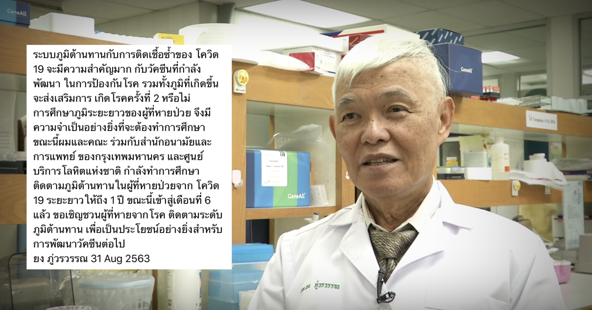 การศึกษาภูมิระยะยาวของผู้ที่หายป่วย จึงมีความจำเป็นอย่างยิ่งที่จะต้องทำการศึกษา ขณะนี้ผมและคณะ ร่วมกับสำนักอนามัยและการแพทย์ ของกรุงเทพมหานคร และศูนย์บริการโลหิตแห่งชาติ กำลังทำการศึกษาติดตามภูมิต้านทานในผู้ที่หายป่วยจาก โควิด-19 ระยะยาวให้ถึง 1 ปี