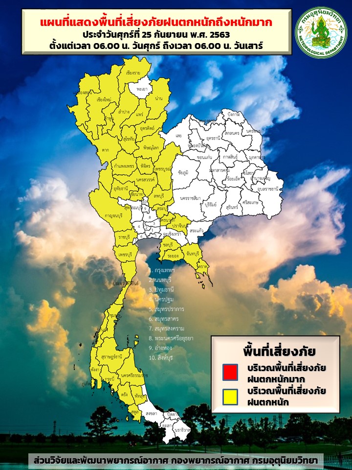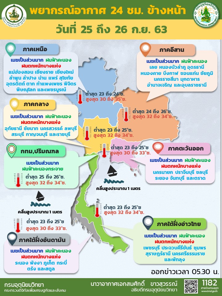 กรมอุตุนิยมวิทยา พยากรณ์อากาศ 24 ชั่วโมงข้างหน้า บริเวณประเทศไทยมีฝนตกหนักบางแห่งบริเวณภาคเหนือ ภาคตะวันออก และภาคใต้ ทั้งนี้เนื่องจากร่องมรสุมพาดผ่านภาคเหนือตอนล่าง ภาคกลางตอนบน และภาคตะวันออกเฉียงเหนือตอนล่าง เข้าสู่หย่อมความกดอากาศต่ำบริเวณทะเลจีนใต้ตอนกลาง ประกอบกับมรสุมตะวันตกเฉียงใต้ยังคงพัดปกคลุมทะเลอันดามัน และภาคใต้ ขอให้ประชาชนที่อาศัยอยู่ในพื้นที่เสี่ยงภัยบริเวณดังกล่าวระวังอันตรายจากฝนตกหนักและฝนที่ตกสะสมไว้ด้วย