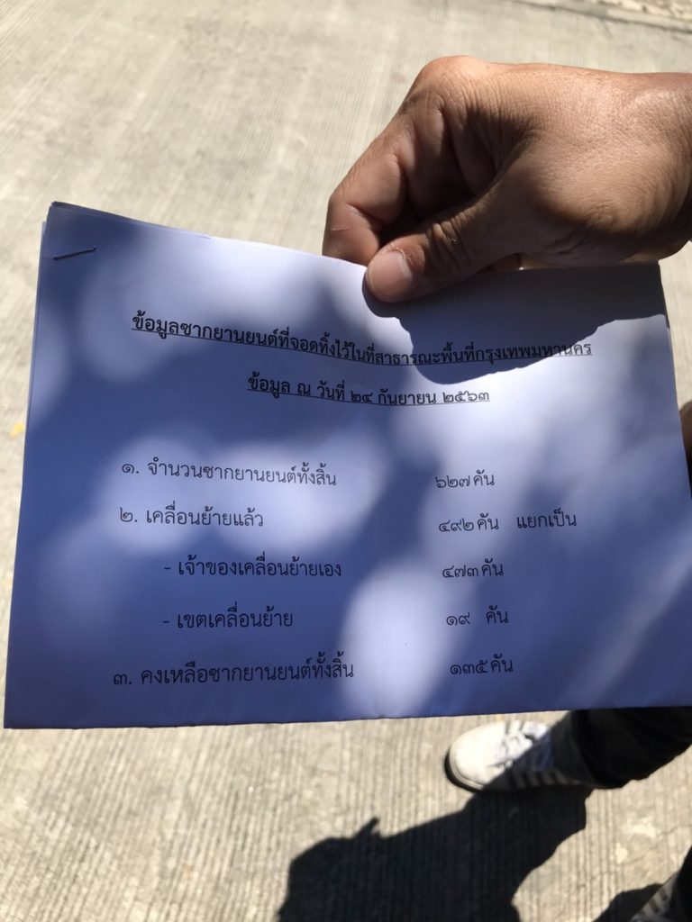 โดยสถิติภาพรวมในพื้นที่กรุงเทพฯ ปีนี้ข้อมูลถึงวันที่ 24 กันยายน 2563 ได้รับรายงานซากรถที่ถูกจอดทิ้งทั่วกรุงเทพรวม 627 คัน เคลื่อนย้ายแล้ว 492 คัน แบ่งเป็นเจ้าของเคลื่อนย้ายเอง 473 คัน และเขตเคลื่อนย้าย 19 คัน ยังคงเหลือรถรอเคลื่อนย้าย 135 คัน โดยเป็นไปตามนโยบายของผู้ว่าราชการกรุงเทพมหานคร ที่เข้มงวดปัญหาการจอดทิ้งซากรถยนต์ไว้บนถนนหรือสถานที่สาธารณะ ซึ่งเป็นเรื่องที่ประชาชนร้องเรียนเข้ามามาก เนื่องจากกีดขวางการจราจร และส่งผลต่อปัญหาความปลอดภัยของประชาชน รวมถึงส่งผลต่อความสะอาดบริเวณจุดที่รถจอดทิ้งไว้นาน