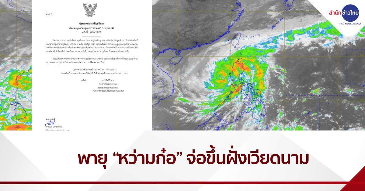 กรมอุตุนิยมวิทยา ออกประกาศเตือน “พายุโซนร้อนกำลังแรง “หว่ามก๋อ” (พายุระดับ 4)” ฉบับที่ 2 ลงวันที่ 12 พฤศจิกายน 2563 เมื่อเวลา 16.00 น. ของวันนี้ (12 พฤศจิกายน 2563) พายุโซนร้อนกำลังแรง “หว่ามก๋อ” (พายุระดับ 4) บริเวณทะเลจีนใต้ตอนกลาง ความเร็วลมสูงสุดใกล้ศูนย์กลางประมาณ 100 กิโลเมตรต่อชั่วโมง กำลังเคลื่อนตัวทางทิศตะวันตกด้วยความเร็วประมาณ 20 กิโลเมตรต่อชั่วโมง คาดว่าจะทวีกำลังแรงขึ้นและเคลื่อนเข้าใกล้ชายฝั่งประเทศเวียดนามประมาณวันที่ 15 พฤศจิกายน 2563 หลังจากนั้นจะอ่อนกำลังลงตามลำดับ
