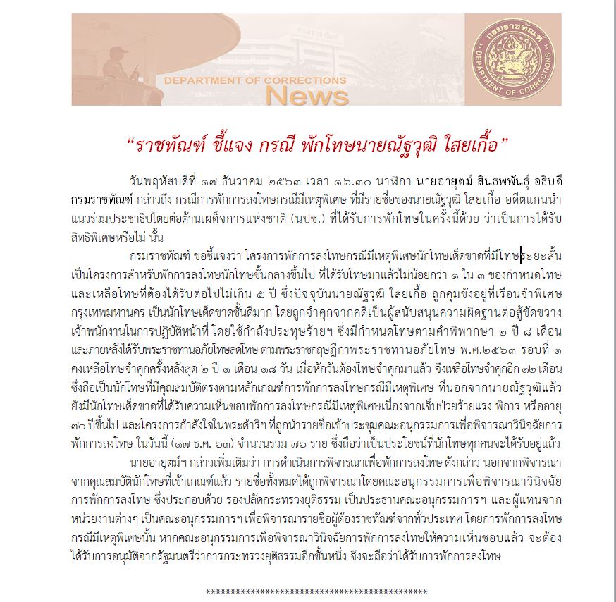 กรมราชทัณฑ์ ขอชี้แจงว่า โครงการพักการลงโทษกรณีมีเหตุพิเศษนักโทษเด็ดขาดที่มีโทษระยะสั้น เป็นโครงการสำหรับพักการลงโทษนักโทษชั้นกลางขึ้นไป ที่ได้รับโทษมาแล้วไม่น้อยกว่า 1 ใน 3 ของกำหนดโทษ และเหลือโทษที่ต้องได้รับต่อไปไม่เกิน 5 ปี ซึ่งปัจจุบันนายณัฐวุฒิ ใสยเกื้อ ถูกคุมขังอยู่ที่เรือนจำพิเศษกรุงเทพมหานคร เป็นนักโทษเด็ดขาดชั้นดีมาก โดยถูกจำคุกจากคดีเป็นผู้สนับสนุนความผิดฐานต่อสู้ขัดขวางเจ้าพนักงานในการปฏิบัติหน้าที่ โดยใช้กำลังประทุษร้ายฯ ซึ่งมีกำหนดโทษตามคำพิพากษา 2 ปี 8 เดือน