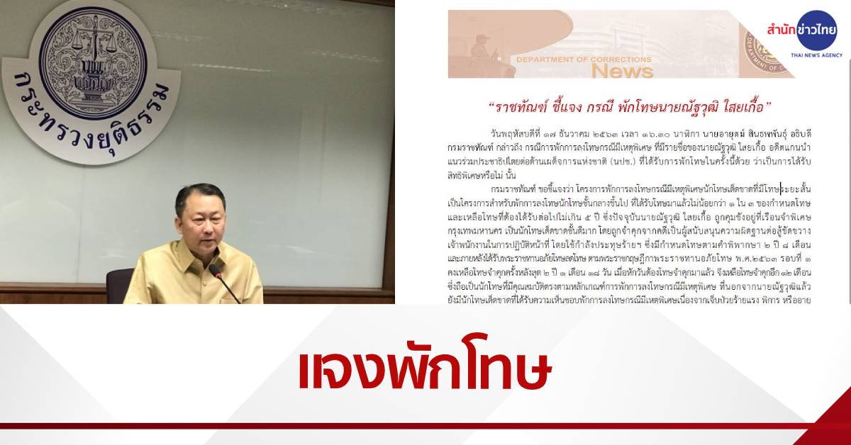 กทม. 17 ธ.ค. – อธิบดีกรมราชทัณฑ์ ชี้แจงกรณีพักโทษ “ณัฐวุฒิ ใสยเกื้อ” อดีตแกนนำ นปช. เป็นนักโทษที่มีคุณสมบัติตรงตามหลักเกณฑ์การพักโทษกรณีมีเหตุพิเศษ