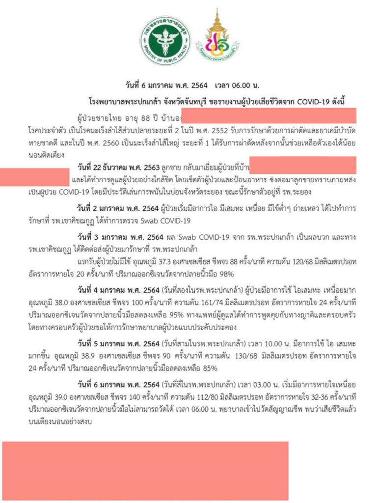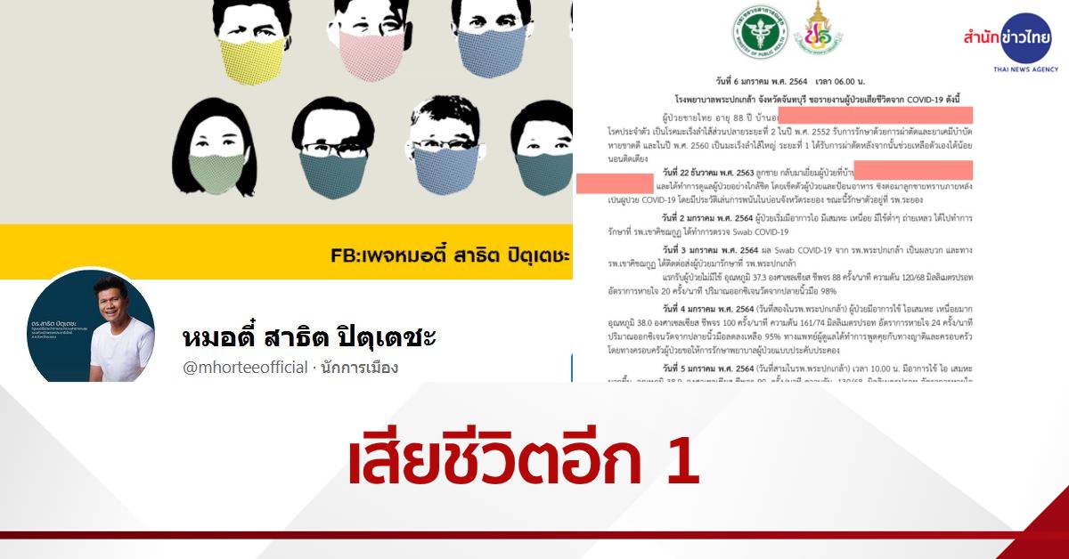6 ม.ค. -เฟซบุ๊ก “หมอตี๋ สาธิต ปิตุเตชะ” โพสต์รายงานมีผู้เสียชีวิตจาก #โควิด19 อีก 1 ราย ที่ รพ.พระปกเกล้า จ.จันทบุรี เป็นชายไทยอายุ 88 ปี มีโรคประจำตัว เป็นมะเร็งลำไส้ ป่วยติดเตียง พบติดเชื้อจากลูกชาย มีประวัติไปเล่นพนันที่บ่อน จ.ระยอง