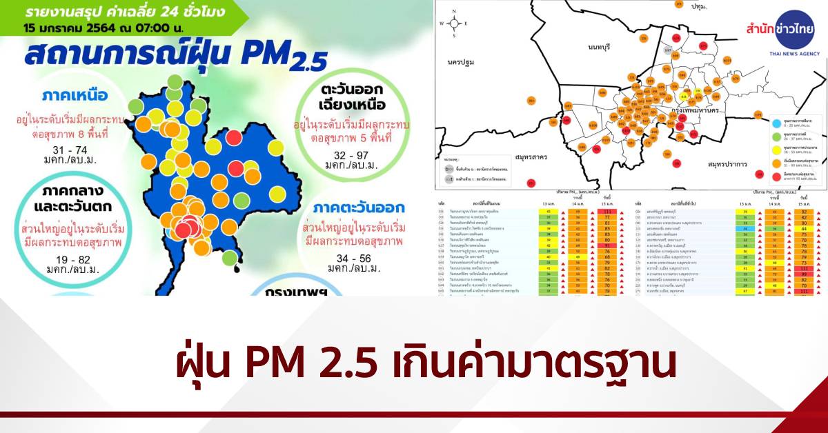 ศูนย์แก้ไขปัญหามลพิษทางอากาศ รายงานคุณภาพอากาศ วันนี้ 15 มกราคม 2564 เวลา 07.00 น. ปริมาณ PM 2.5 เกินค่ามาตรฐานใน กรุงเทพฯ จ.ปทุมธานี จ.นนทบุรี จ.นครปฐม จ.สมุทรสาคร จ.สมุทรปราการ จ.เชียงใหม่ จ.ลำปาง จ.พิษณุโลก จ.ตาก จ.เพชรบูรณ์ จ.อุทัยธานี จ.ลพบุรี จ.สระบุรี จ.สุพรรณบุรี จ.พระนครศรีอยุธยา จ.กาญจนบุรี จ.ปราจีนบุรี จ.สระแก้ว จ.ฉะเชิงเทรา จ.สมุทรสงคราม จ.ชลบุรี จ.ระยอง จ.หนองคาย จ.ขอนแก่น จ.ร้อยเอ็ด จ.ชัยภูมิ และนครราชสีมา