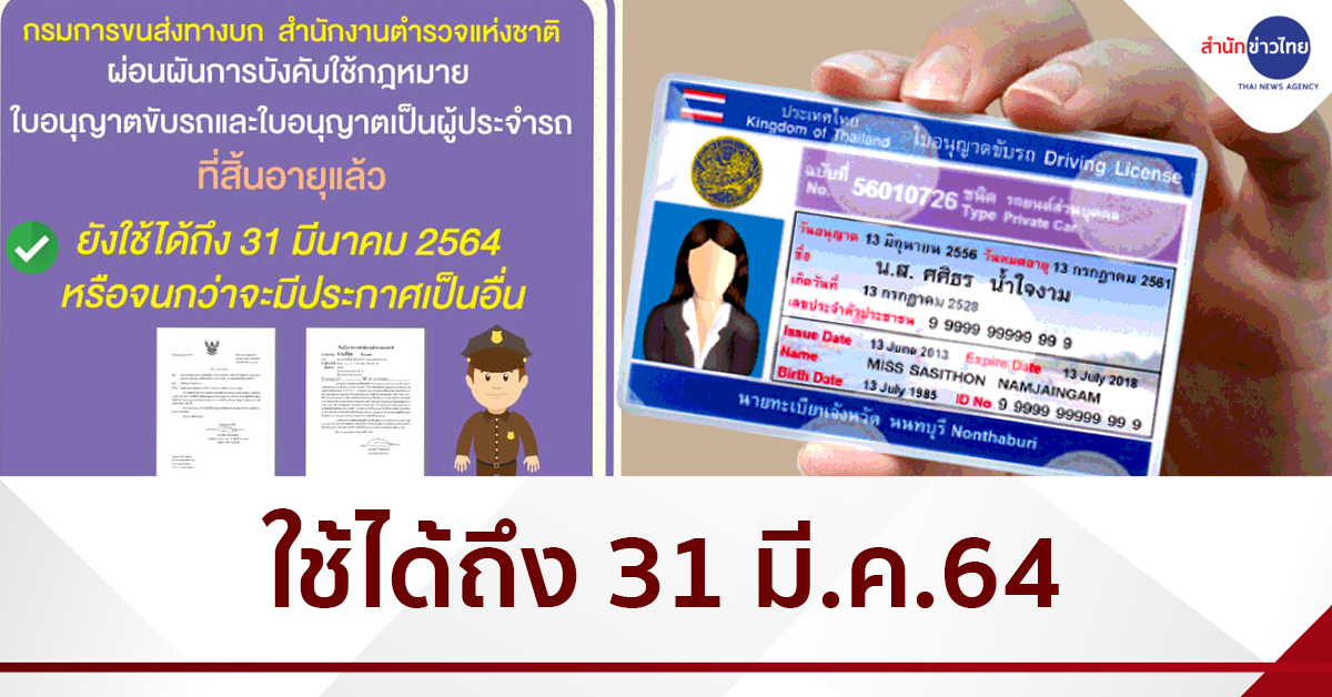 16 ม.ค.-กรมการขนส่งทางบก เผยได้รับการยืนยันจากสำนักงานตำรวจแห่งชาติ ผ่อนผันการบังคับใช้กฎหมาย ใบขับขี่ที่สิ้นอายุแล้วยังใช้ได้ถึง 31 มีนาคม 2564 หรือจนกว่าจะมีประกาศเป็นอย่างอื่น เพื่อบรรเทาความเดือดร้อนให้ผู้ขับขี่รถและผู้ประกอบการขนส่ง