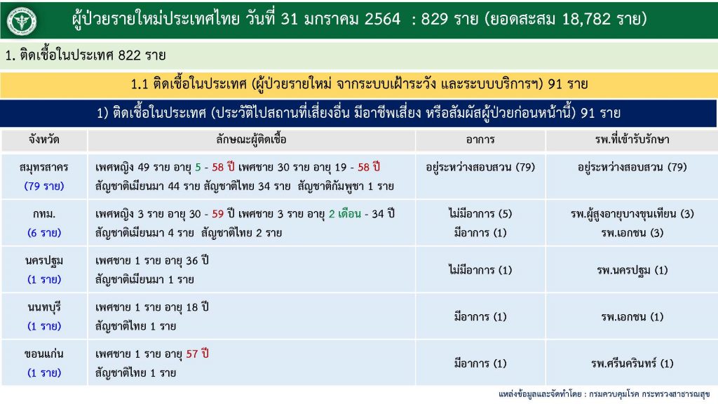 กทม. 31 ม.ค. – ศูนย์ข้อมูล COVID-19 รายงานสถานการณ์การติดเชื้อ COVID-19 ในประเทศ วันอาทิตย์ที่ 31 มกราคม 2564 พบผู้ป่วยรายใหม่ 829 ราย ผู้ป่วยยืนยันสะสม 18,782 ราย รักษาหายเพิ่ม 110 ราย รวมหายป่วยแล้ว 11,615 ราย ยังรักษาอยู่ในโรงพยาบาล 7,090 ราย เสียชีวิตสะสม 77 ราย