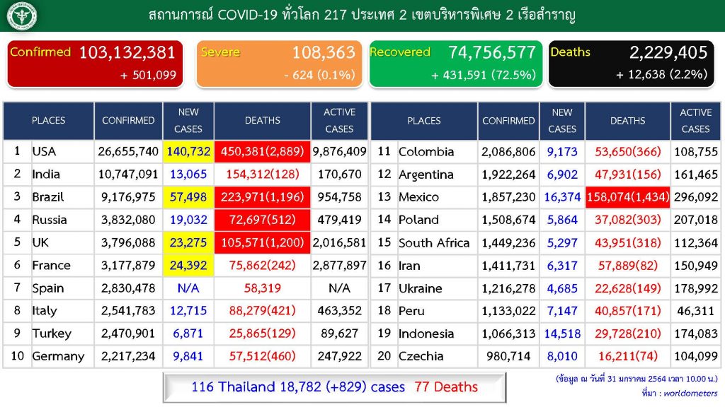 ประเทศไทย อยู่ในอันดับที่ 116 จำนวน 18,782 ราย. – สำนักข่าวไทย