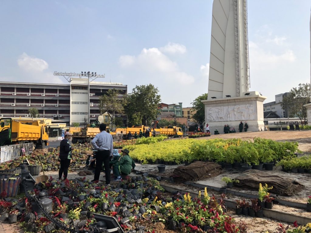 เมื่อช่วงเช้าที่ผ่านมา เจ้าหน้าที่สำนักงานสวนสาธารณะ สำนักสิ่งแวดล้อม กรุงเทพมหานคร ทำการคัดแยกไม้ดอกไม้ประดับที่เคยตกแต่งโดยรอบอนุสาวรีย์ประชาธิปไตย ที่เสียหายจากการรื้อทำลายของกลุ่มผู้ชุมนุมเมื่อวานนี้ มีทั้ง ต้นเทียนทอง ต้นสร้อยไก่ ผักโขมแดงและชะแมบทอง เบื้องต้นพบว่าไม้ดอกไม้ และต้นไม้ เสียหายประมาณร้อยละ 70-80 ซึ่งส่วนที่เสียหายจะทำการขนย้ายกลับไปทำเป็นปุ๋ย ส่วนที่ยังไม่เสียหาย หรือ เสียหายไม่มากจะนำกลับมาประดับตกแต่งซ้ำ และนำต้นไม้มาเสริมเพิ่มเติม