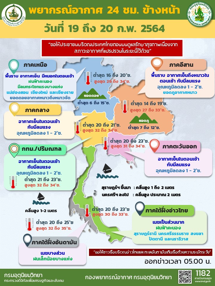 กรมอุตุนิยมวิทยา พยากรณ์อากาศ 24 ชั่วโมงข้างหน้า ภาคตะวันออกเฉียงเหนือมีอากาศเย็นถึงหนาว ส่วนภาคอื่นๆ มีอากาศเย็นโดยทั่วไป กับมีลมแรง และอุณหภูมิลดลง 1-2 องศาเซลเซียส บริเวณยอดดอยและยอดภู มีอากาศหนาวถึงหนาวจัด เนื่องจากบริเวณความกดอากาศสูงหรือมวลอากาศเย็นกำลังปานกลางจากประเทศจีนยังคงแผ่ปกคลุมภาคตะวันออกเฉียงเหนือ ภาคตะวันออก ภาคกลางของประเทศไทย และทะเลจีนใต้ ในขณะที่ลมตะวันออกเฉียงใต้ยังคงพัดปกคลุมภาคเหนือ ทำให้บริเวณดังกล่าวมีฝนฟ้าคะนองและลมกระโชกแรงบางแห่ง ขอให้ประชาชนบริเวณประเทศไทยตอนบนดูแลรักษาสุขภาพ เนื่องจากสภาวะอากาศที่แปรปรวนในระยะนี้ไว้ด้วย