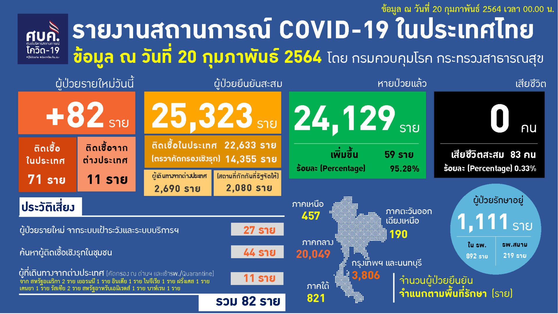กทม. 20 ก.พ.-ศบค. รายงานโควิด-19 วันนี้ พบผู้ติดเชื้อเพิ่ม 82 ราย ยอดป่วยยืนยันสะสม 25,323 ราย รักษาหายอีก 59 ราย เสียชีวิตสะสม 83 ราย