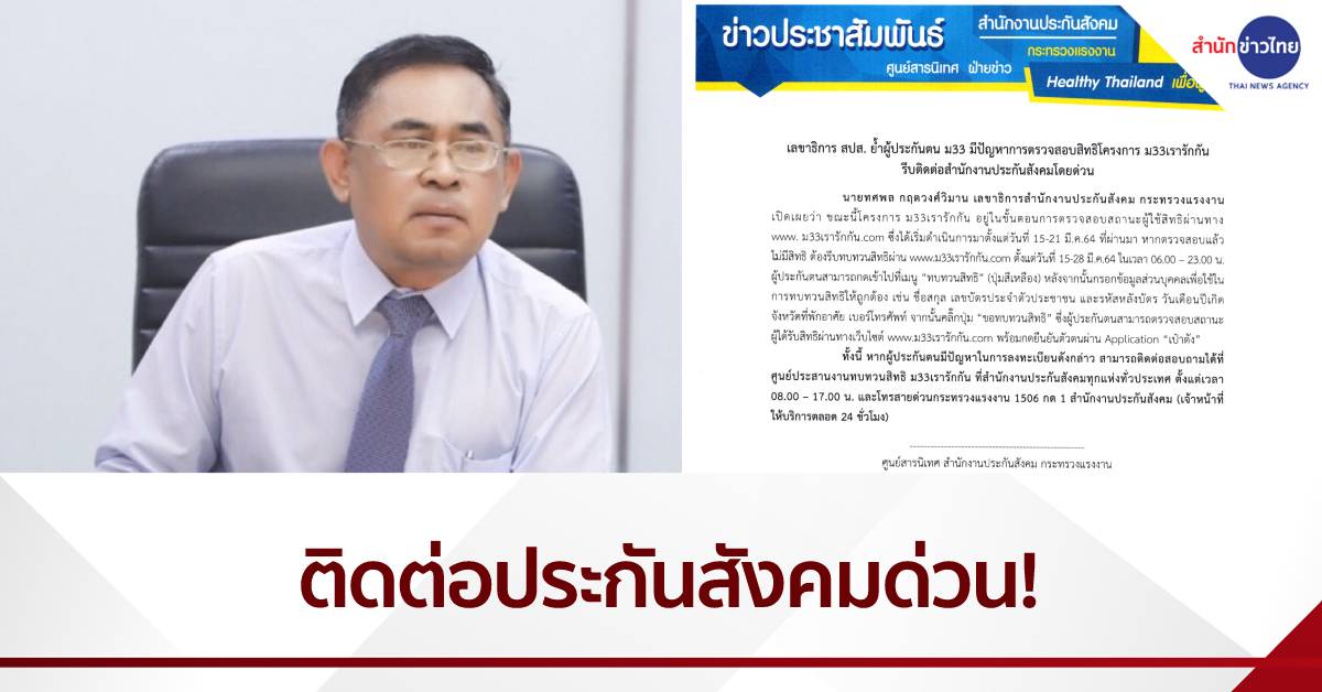 กทม. 17 มี.ค.-เลขาธิการ สปส. ย้ำผู้ประกันตน ม.33 มีปัญหาการตรวจสอบสิทธิโครงการ “ม33เรารักกัน” รีบติดต่อสำนักงานประกันสังคมโดยด่วน