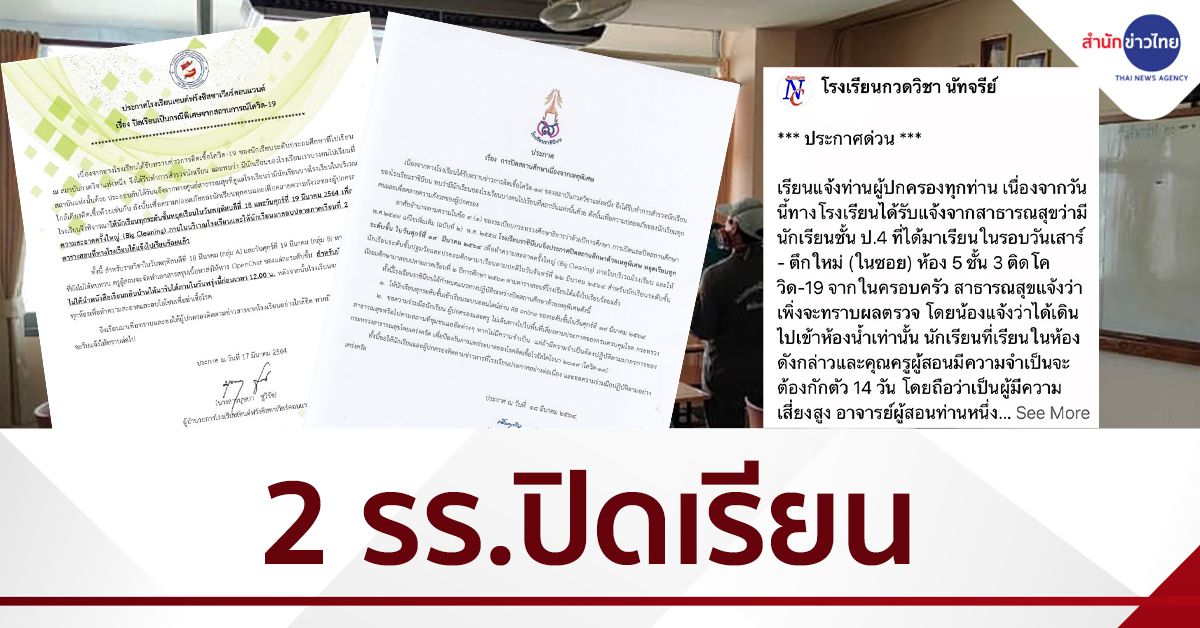 สำนักข่าวไทย 18 มี.ค.-รร.ราชินีบน และเซนต์ฟรังฯ ออกประกาศปิดเรียนด้วยเหตุพิเศษ เนื่องจากมีนักเรียนไปที่สถาบันกวดวิชา ซึ่งมีนักเรียนชั้น ป.4 ติดเชื้อโควิดจากครอบครัว