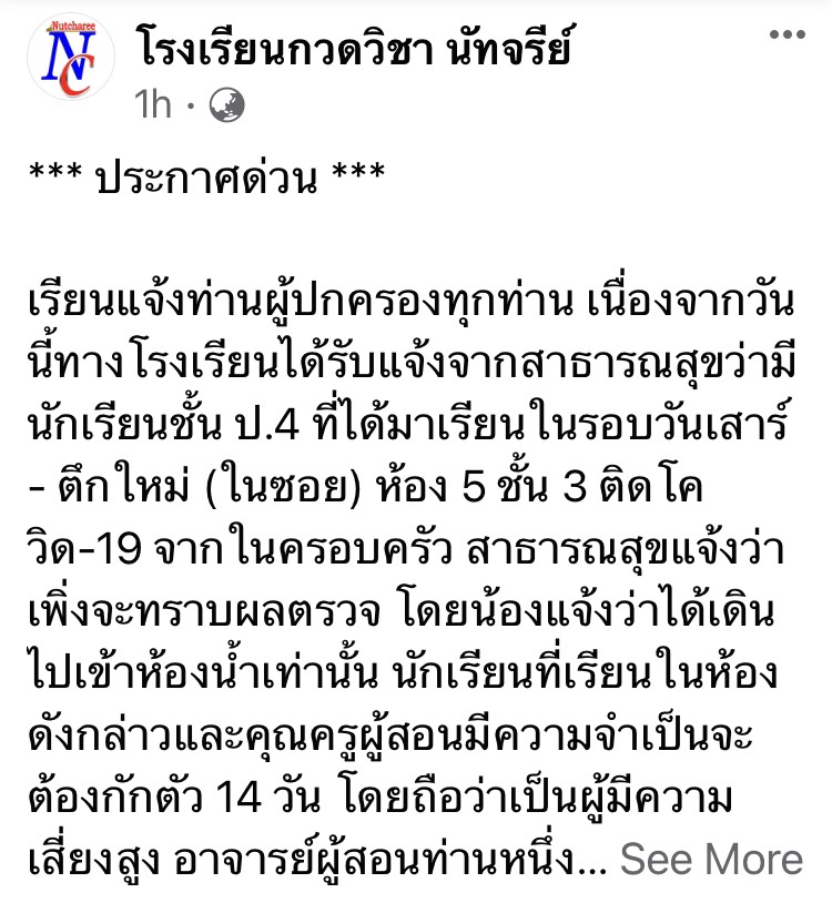 วันนี้ (18 มี.ค.) โรงเรียนกวดวิชา นัทจรีย์ ซึ่งตั้งอยู่ตรงข้าม รร.สตรีวิทยา ถนนดินสอ เขตพระนคร กทม.โพสต์ผ่านเพจเฟซบุ๊กว่า ประกาศด่วน เรียนแจ้งท่านผู้ปกครองทุกท่าน เนื่องจากวันนี้ทางโรงเรียนได้รับแจ้งจากสาธารณสุขว่า มีนักเรียนชั้น ป.4 ที่ได้มาเรียนในรอบวันเสาร์-ตึกใหม่ (ในซอย) ห้อง 5 ชั้น 3 ติดโควิด-19 จากในครอบครัว สาธารณสุขแจ้งว่าเพิ่งจะทราบผลตรวจ โดยน้องแจ้งว่าได้เดินไปเข้าห้องน้ำเท่านั้น นักเรียนที่เรียนในห้องดังกล่าวและคุณครูผู้สอนมีความจำเป็นจะต้องกักตัว 14 วัน โดยถือว่าเป็นผู้มีความเสี่ยงสูง อาจารย์ผู้สอนท่านหนึ่งได้ไปตรวจในวันนี้ แต่แพทย์แจ้งว่ายังไม่สามารถตรวจได้ให้รอระยะฟักตัว 5-7 วัน ส่วนนักเรียนในชั้นอื่น ทางสาธารณสุขแจ้งว่าไม่จำเป็นต้องกักตัว แต่แนะนำให้ใส่หน้ากากอนามัยอย่างเคร่งครัด หมั่นล้างมือ และสังเกตอาการ ทางโรงเรียนต้องขออภัยอย่างสูงมา ณ ที่นี้ด้วย